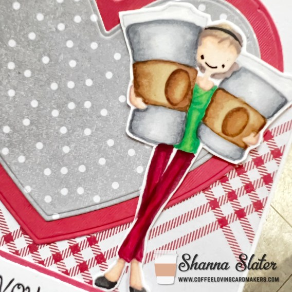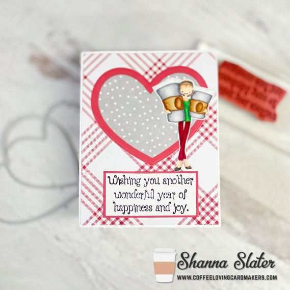 I pulled some pattern papers and a coordinating red together and die cut the panel and 2 hearts. My featured image is called Miss You a Latte from MFT (currently out of stock, but is listed here at super sponsor Butterfly Reflections Ink. I used no line coloring technique and my Copic Markers to color her. I totally forgot how much I love no line coloring!! I grabbed a sentiment from super sponsor Crackerbox Stamps called Wishing Wonderful Year. After stamping the sentiment onto white cardstock I matted it onto the same red and adhered it to the card panel towards the bottom. The 2 die cut hearts were adhered together and then glued above the sentiment. The Latte Girl was added last off center, allowing the hearts to “ground” her a bit.