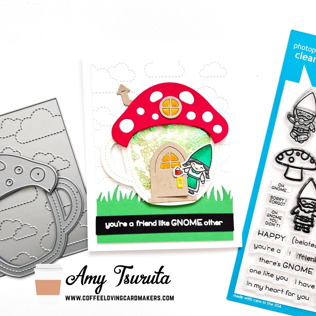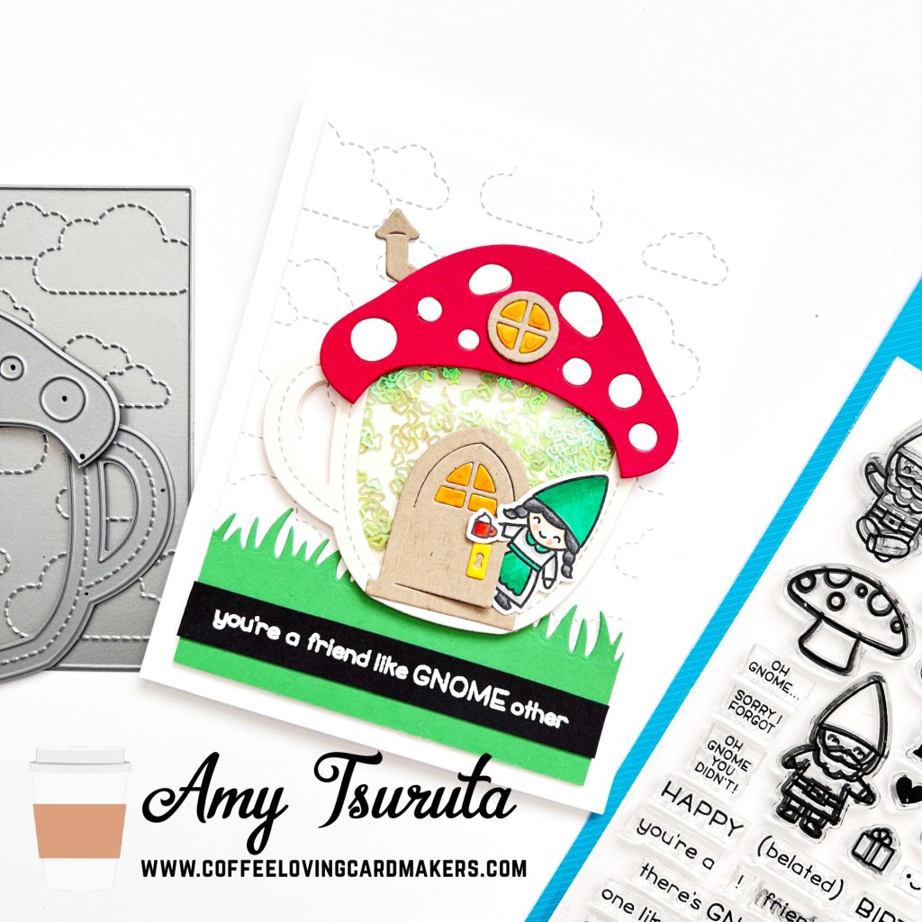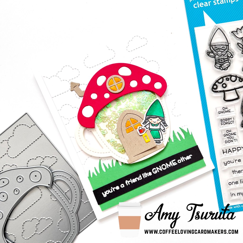 The background is a combo of the Stitched Cloud Backdrop and Grassy Border. The sentiment that has been heat embossed in white on black cardstock is from the Oh Gnome set.
