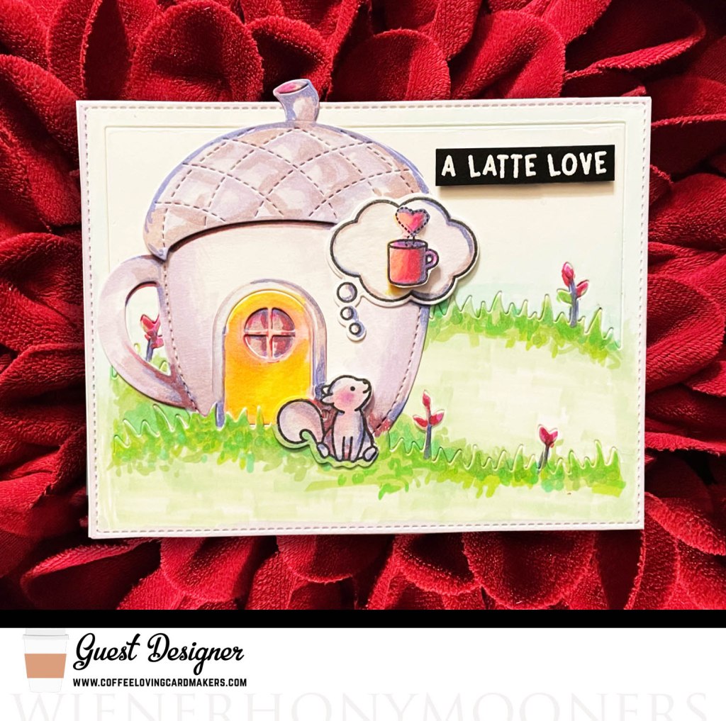 I ended up using a fun array of Lawn Fawn products: Happy Hugs Stamp, Die Set, Outside In Stitched Mug, Acorn House, Sentiment from Thanks a Latte, Meadow Backdrop Landscape, Den Sweet Den Stamp Set.