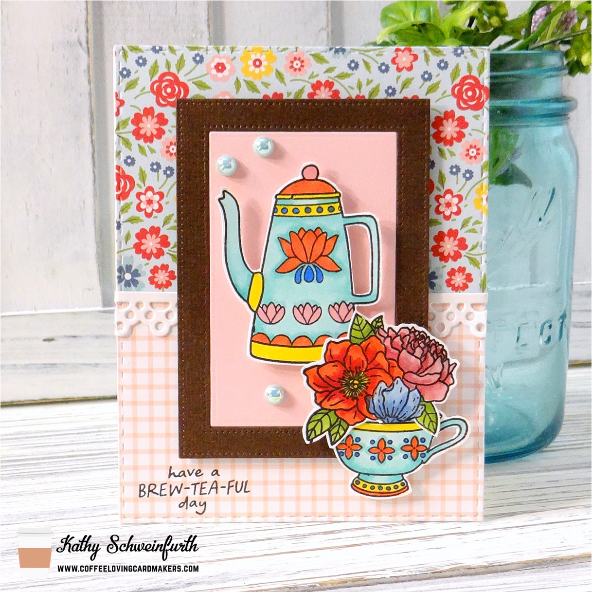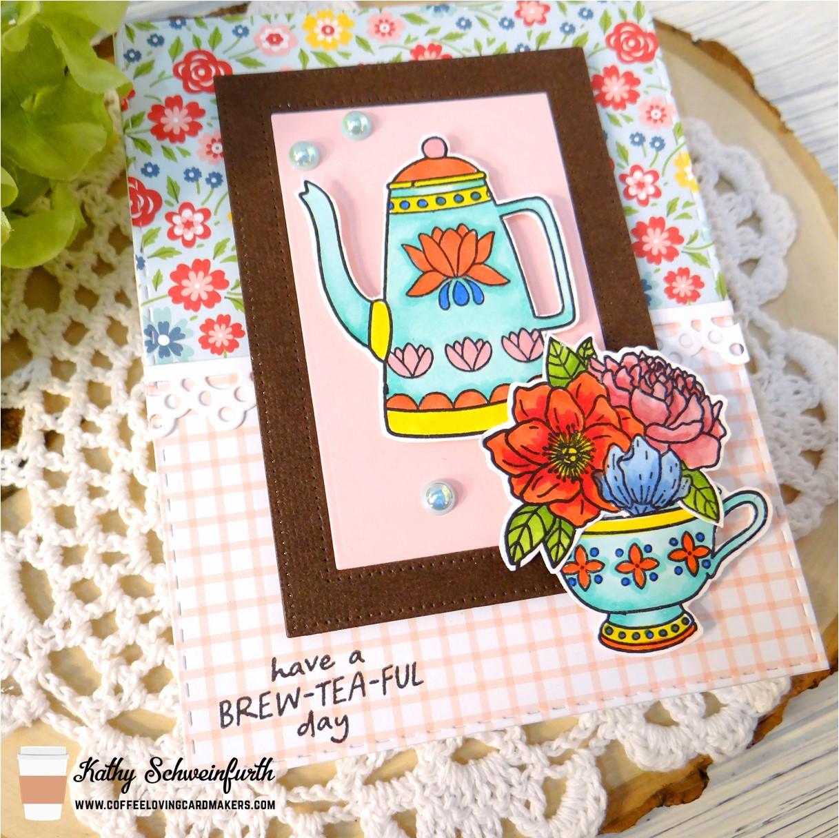 For my card, I cut two designs from Echo Park A Slice of Summer paper pad with Pink & Main Stitched Rectangle Set 1 for the base. I then cut white cardstock from an eyelet border die I found in my stash and adhered it between the two paper designs. The pretty coffee pot, cup and sentiment are from Jane’s Doodles Brew Tea-ful set and I framed the pot with cardstock cut from MFT Stamps Stitched Rectangle Frames dies. The lovely flowers in the cup is from another Jane’s Doodles set called Fresh Cut Flowers. To finish, I added shimmering pearls from Pink & Main Rainbow Pearls Set 2 collection.