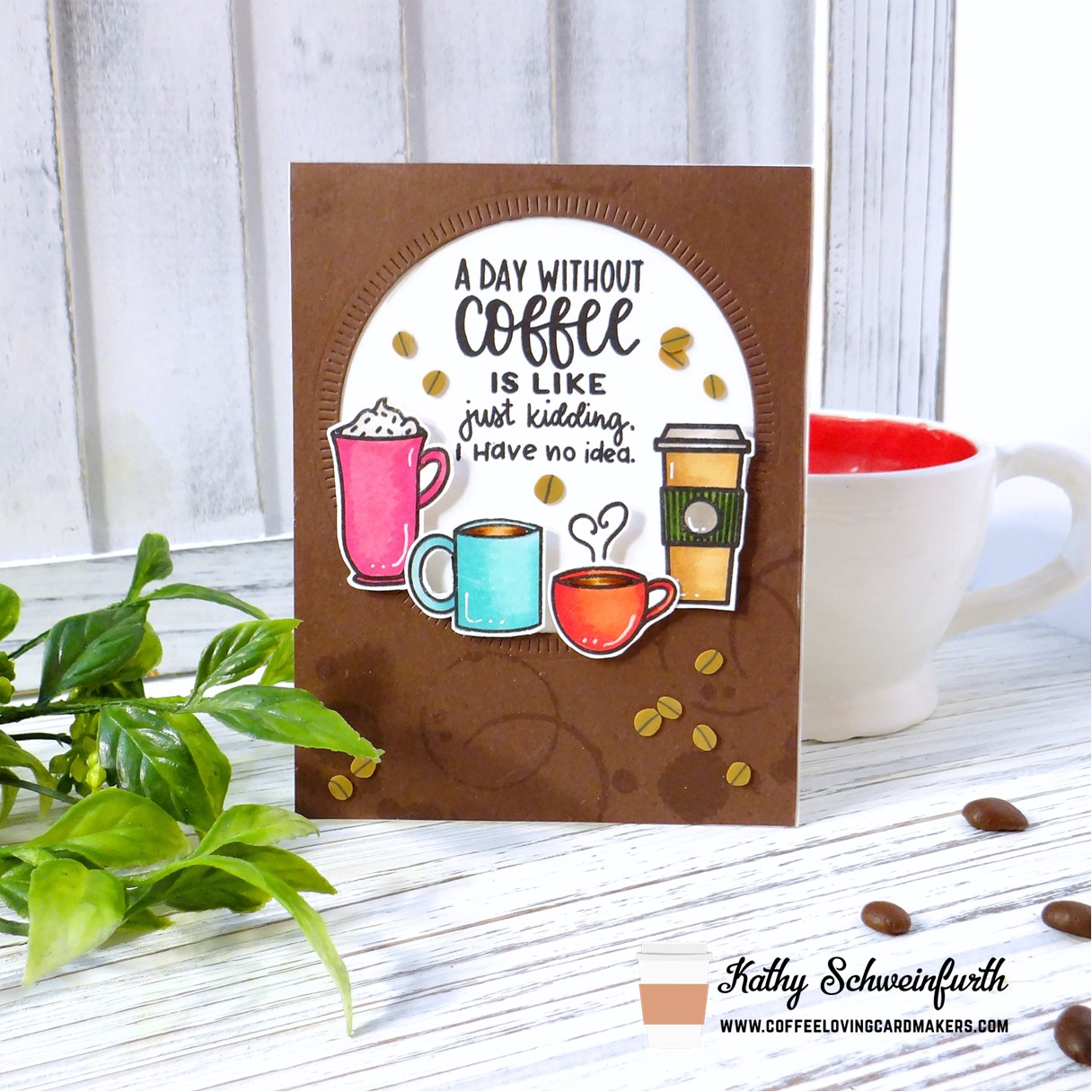 For my card, I cut brown cardstock with Pinkfresh Studio Blanket Stitched Circle die to form an opening then stamped the coffee stains using Sweet ‘n Sassy Stamps Texture Tiles 9 set and a watermark/embossing ink.  These fun coffee cups and sentiment are from a delightful set from Sweet ‘n Sassy Stamps called Coffee Talk.   To finish, I added these cute little coffee bean embellishments from Trinity Stamps.