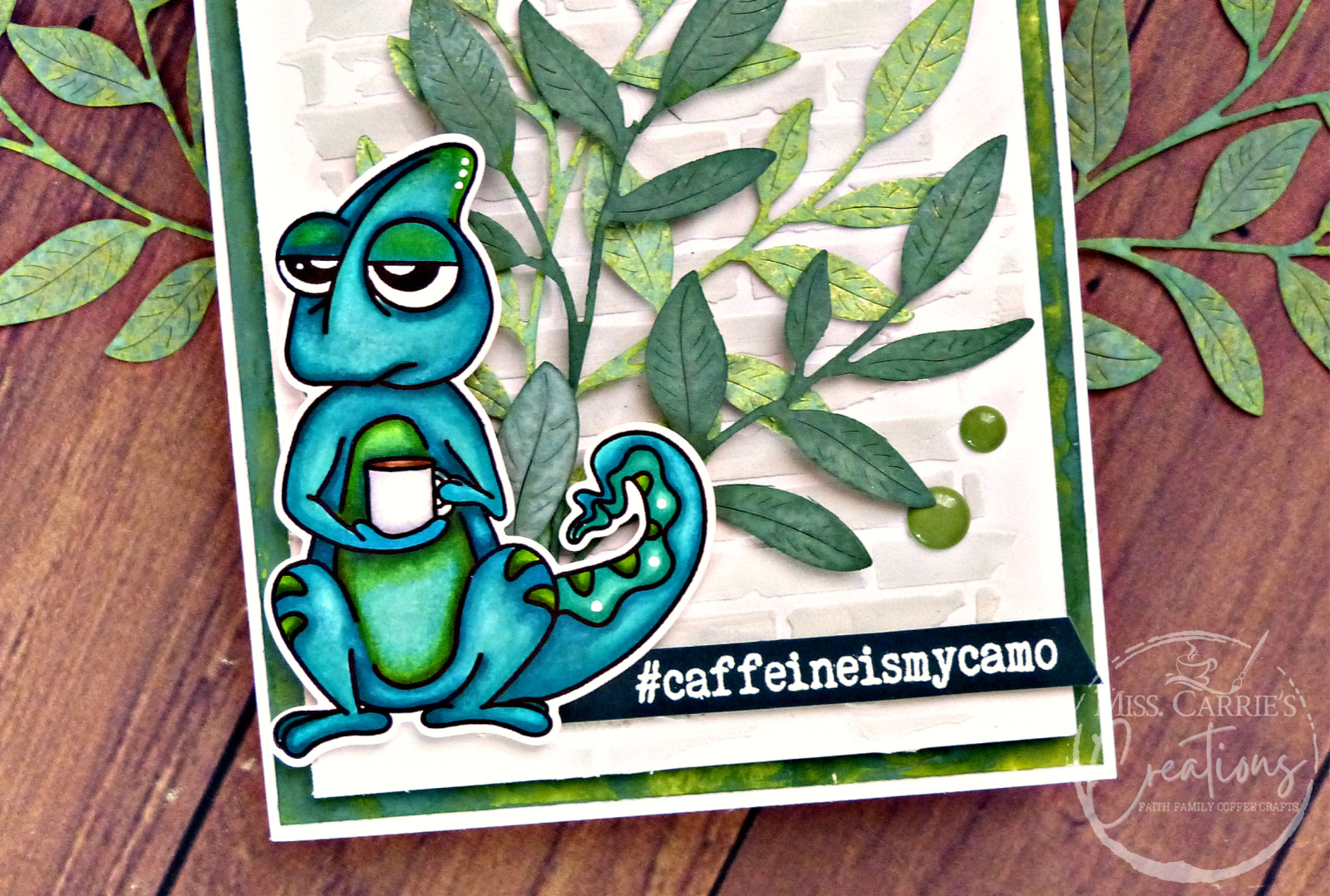Although the layers are a bit unusual for a cartoon character, they came together like the ingredients in my coffee. It all worked perfectly.  The texture paste brick gives a rustic geometric design, and the leaves create a soft layer for the chameleon to sit upon.