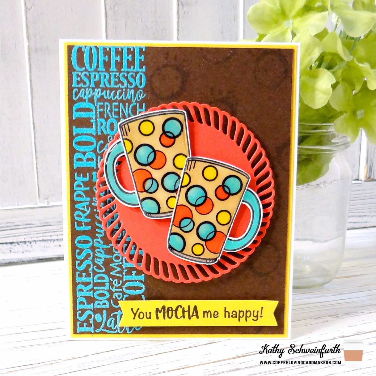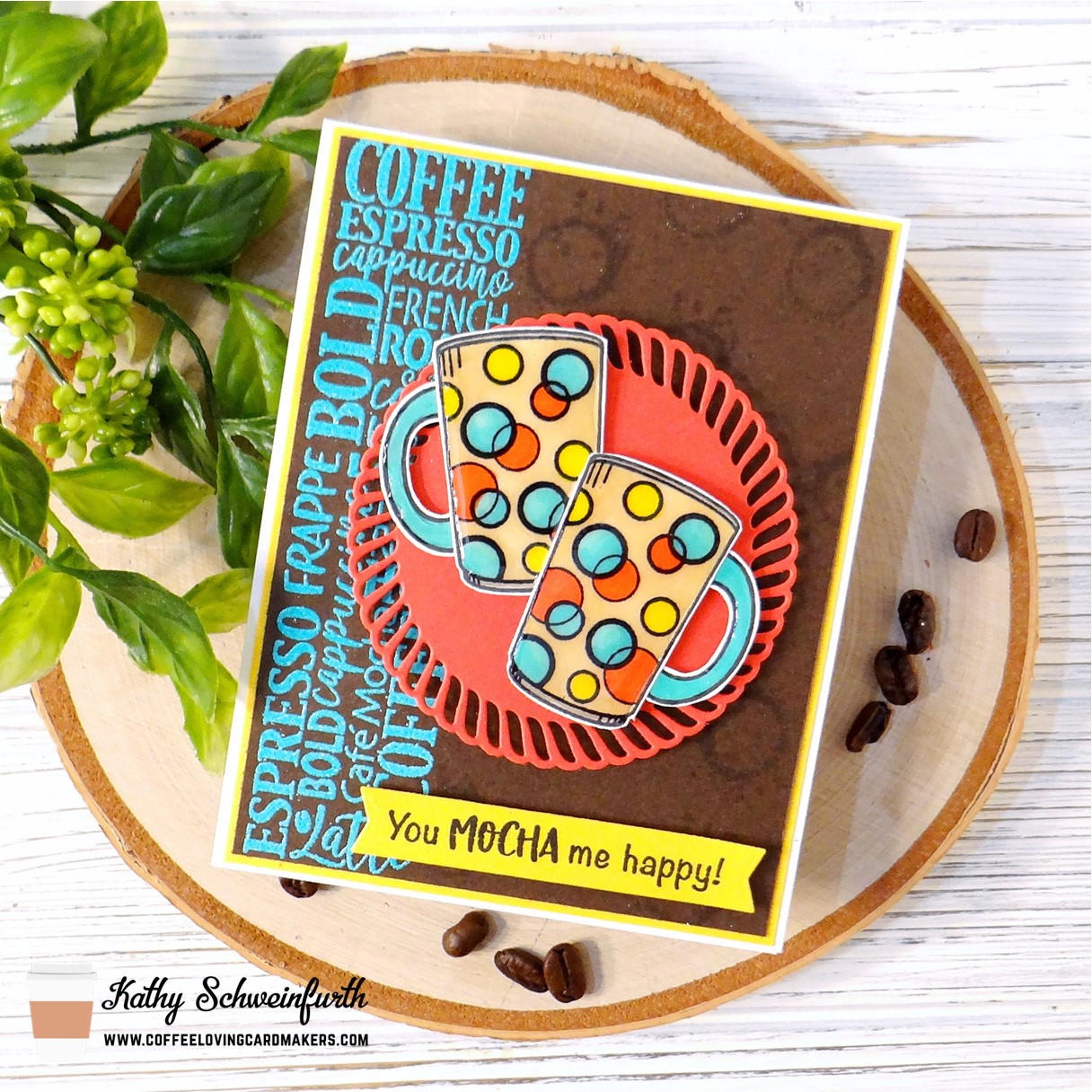 For my card, I used images/sentiment from Dare 2b Artzy Latte Love Stamp Set. I first embossed the word panel with Pink & Main Aquatini Embossing Powder and new Magic Anti-Static Brush. To finish the background, I stamped the coffee stain image with Pink & Main Embossing/Watermark Ink Pad. The backdrop for the mugs was cut from red cardstock using Spellbinders Elegant Twist Circles. I love these fun mug images which I copic colored and then added a glaze over top.