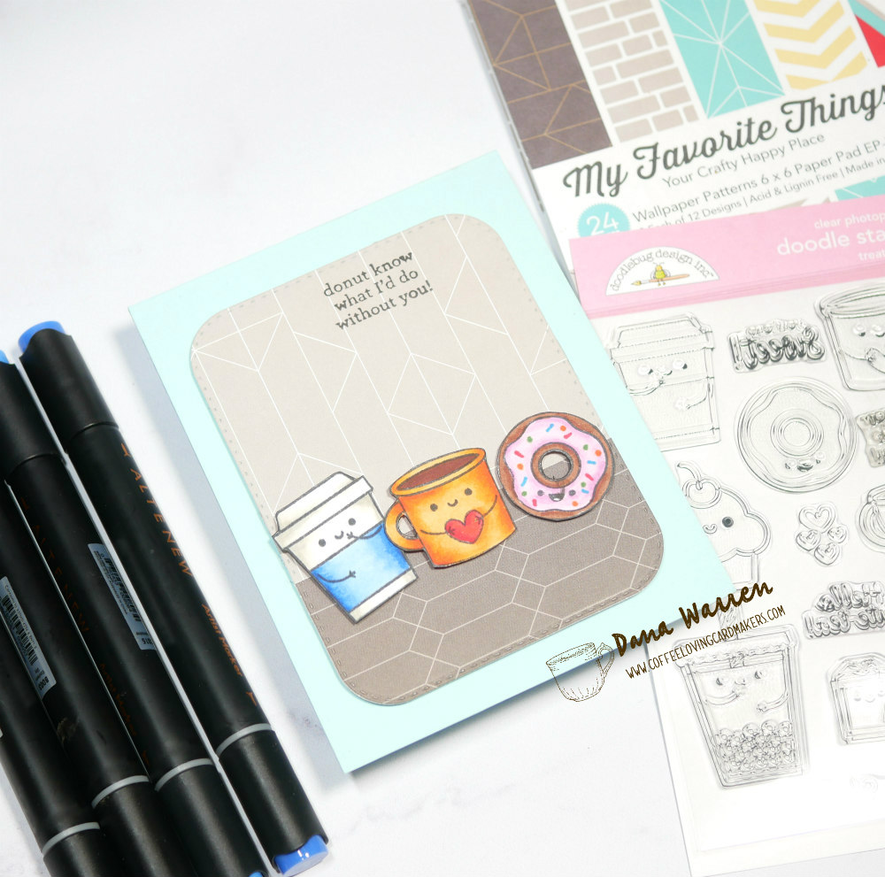 For my casual and playful card, I decided to go a little younger with a Doodlebug Stamp set Treat Yourself! I used my Altenew Alchohol markers to color them, using more boy-inspired blue and orange colors. I colored and fussy cut two coffee cups and a donut.
