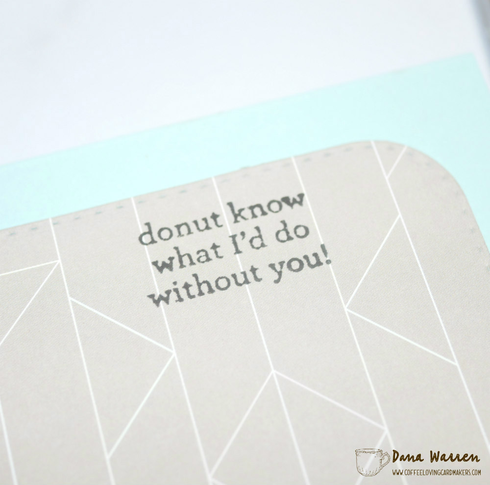 Then I stamped the Donut What I’d Do Without You sentiment near the top and added the pattern rectangle to a light blue card base with foam tape. Last, I added the two coffee cups and a donut to the card with foam tape.