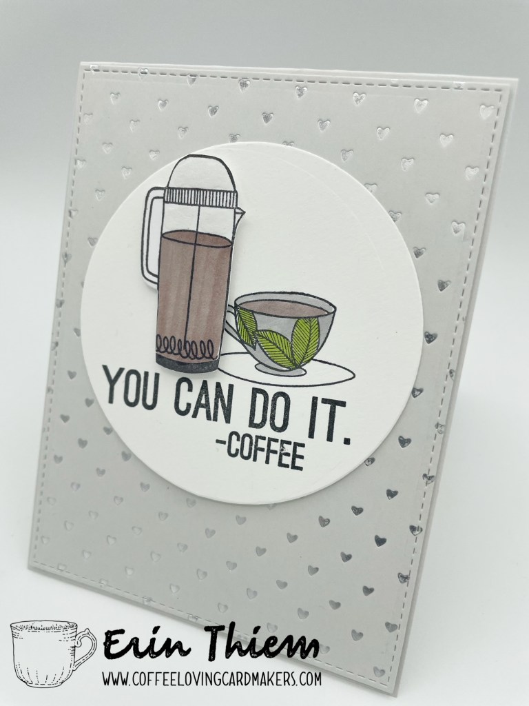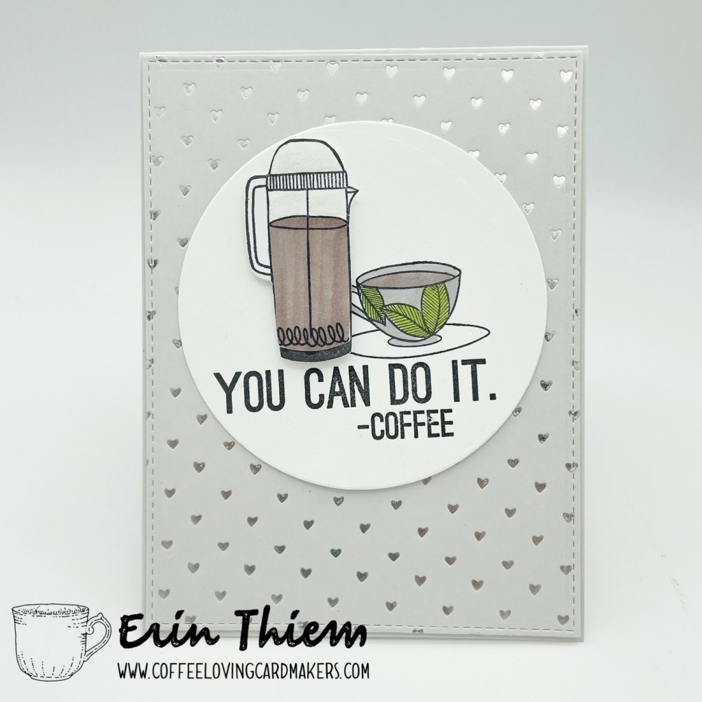 Hello, Erin here, for another Creative Chaos… I actually cleaned my desk earlier this week, so there was order, temporarily. Today’s card pairs Ellen Hutson coffee stamps with a sentiment from The Ton and a foil plate from The Stamp market. I love the CAS look with a little bit of shine.