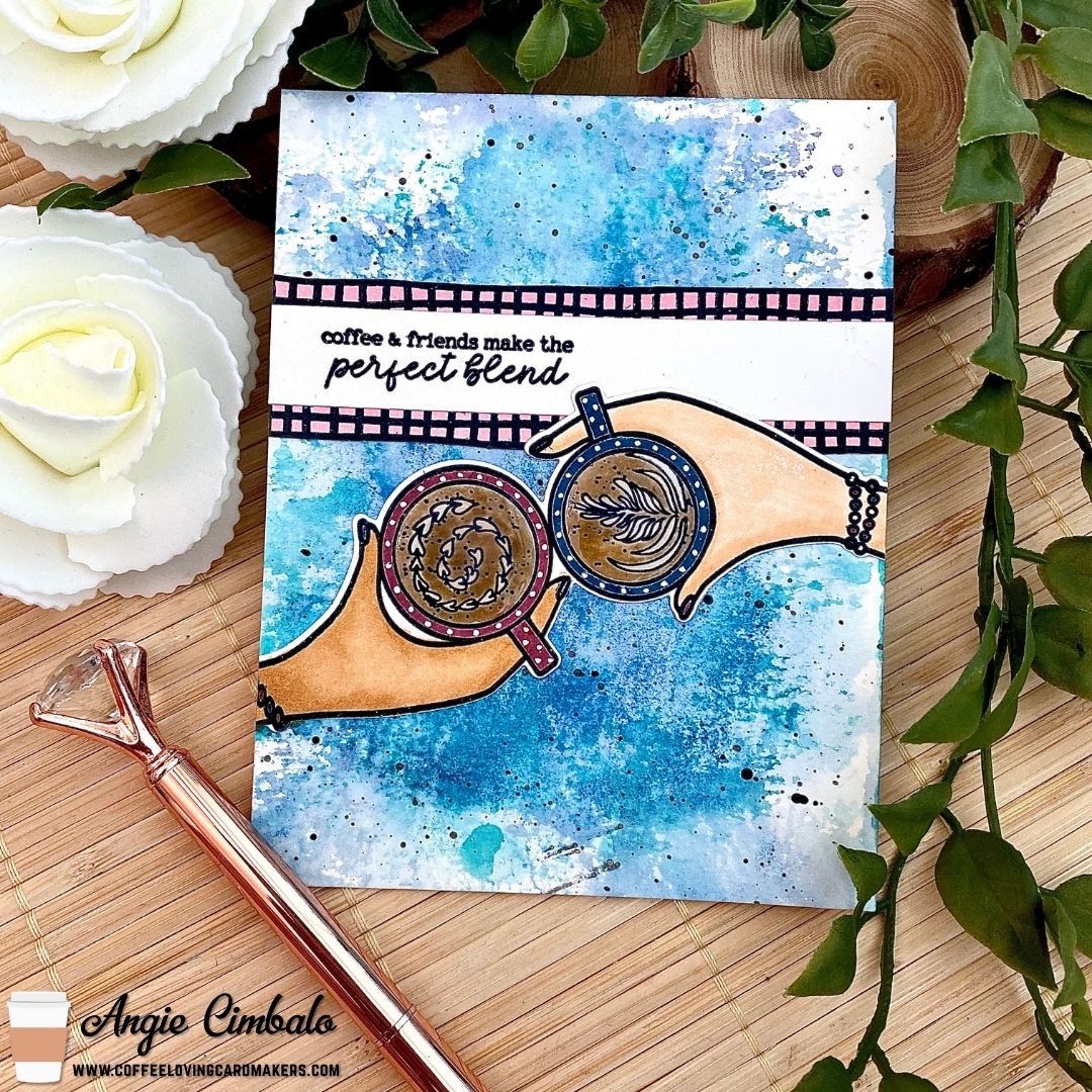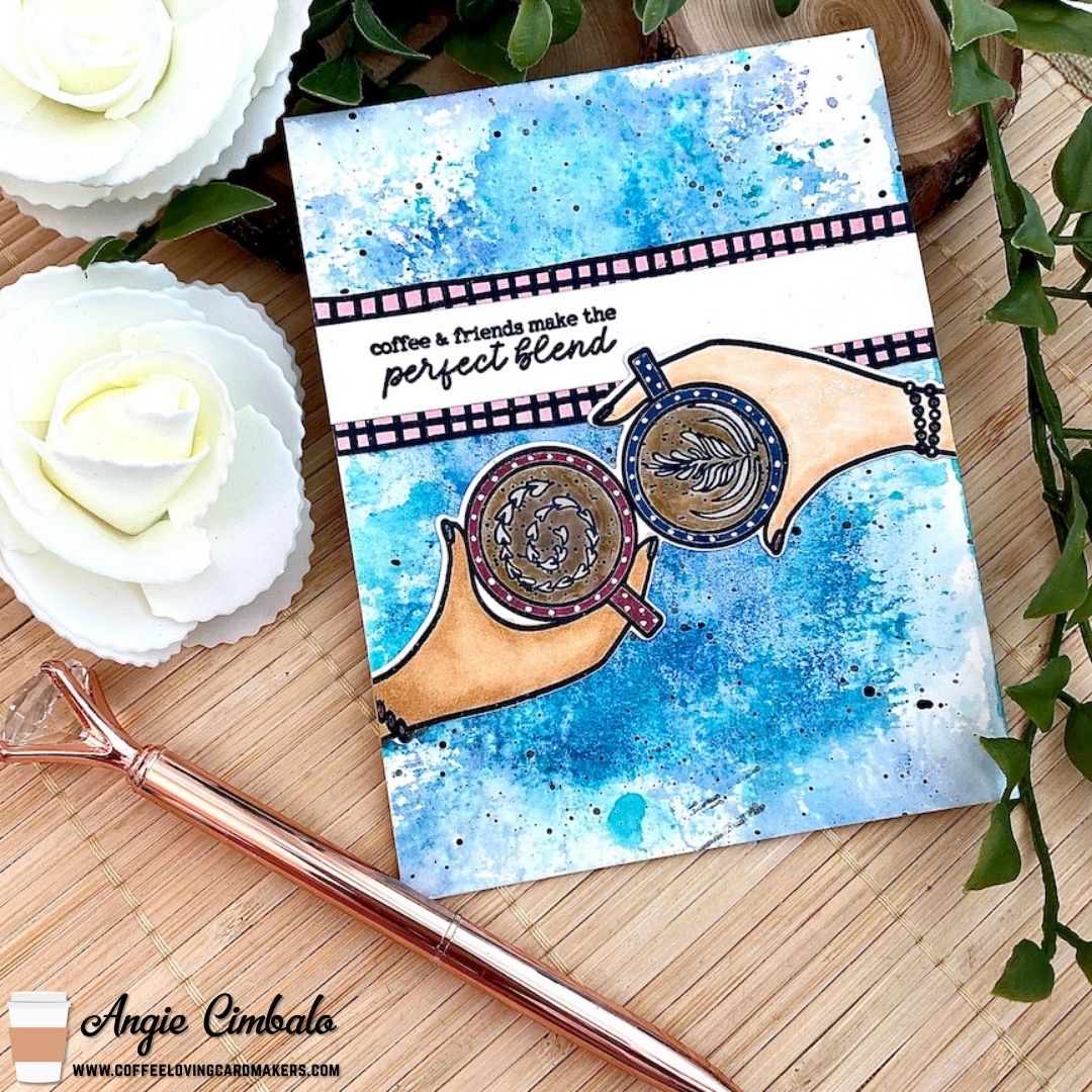 The background was made by smooshing watercolor card into blue Distress Inks and water mixture. I also splattered it with black paint. The grid strip under the sentiment was made with a background stamp, also from Say it With Stamps called “Ditzy Grid.” I stamped colored and cut out the image, then added it to the card on top of the sentiment and grid strip. The sentiment is from the same stamp set, heat embossed in black on white card. Lastly, I added glossy accents to the coffee in the cups. Here’s one last look: