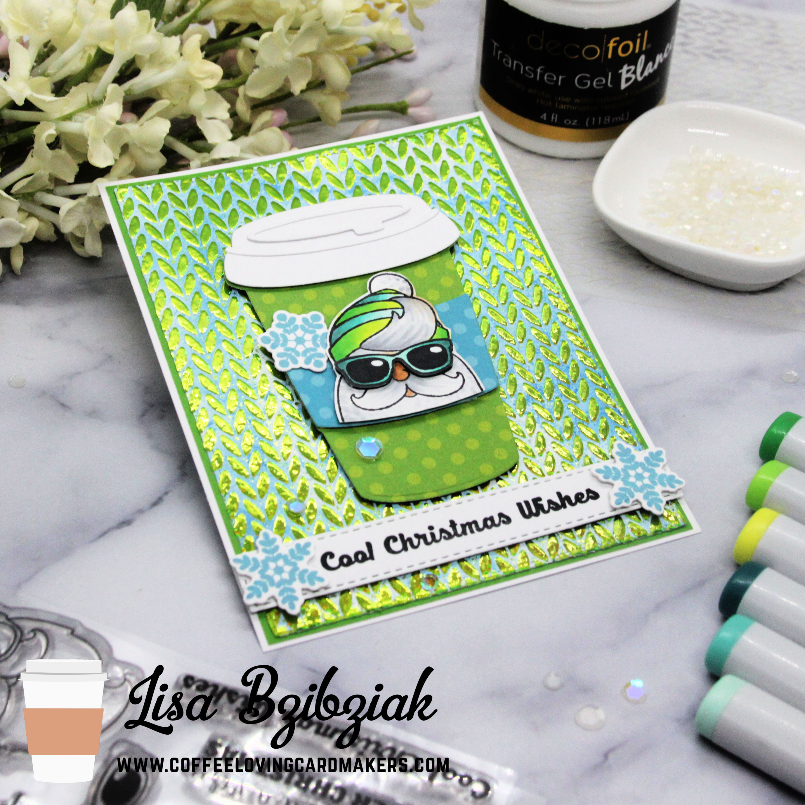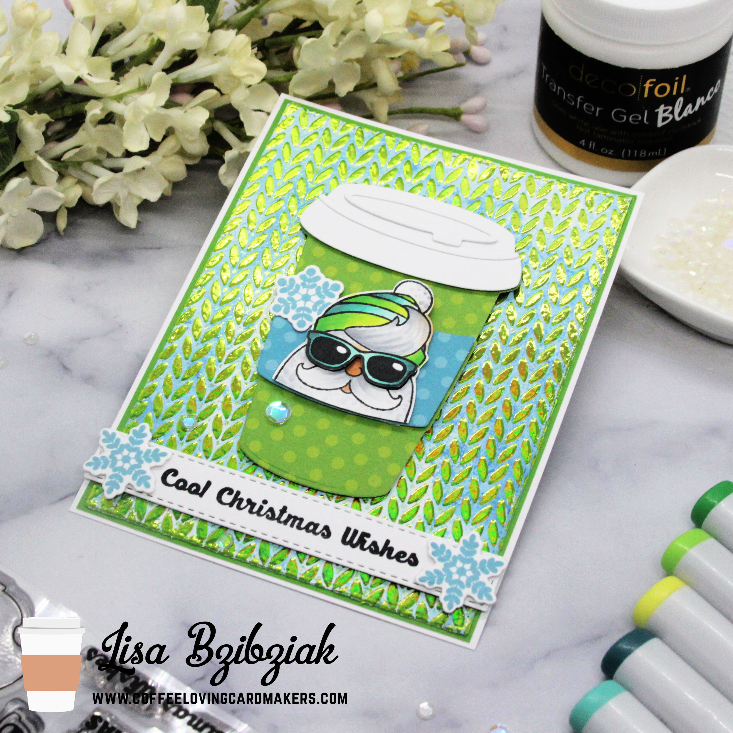 The to go cup is from Kat Scrappiness and Hipster Santa was a stamped image I had a smudge on so I trimmed it off and used it like this! I hate throwing things away!