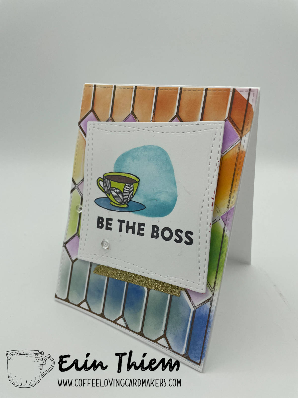 Hello, Erin here for another Creative Chaos. Today’s card pairs the Pink Fresh Studio stainglass foil plate with some stencils, a Hero Arts sentiment, Ellen Hutson Coffee mug, Taylored Expressions stencil and MFT dies. Fun to have a little bit of sparkle.