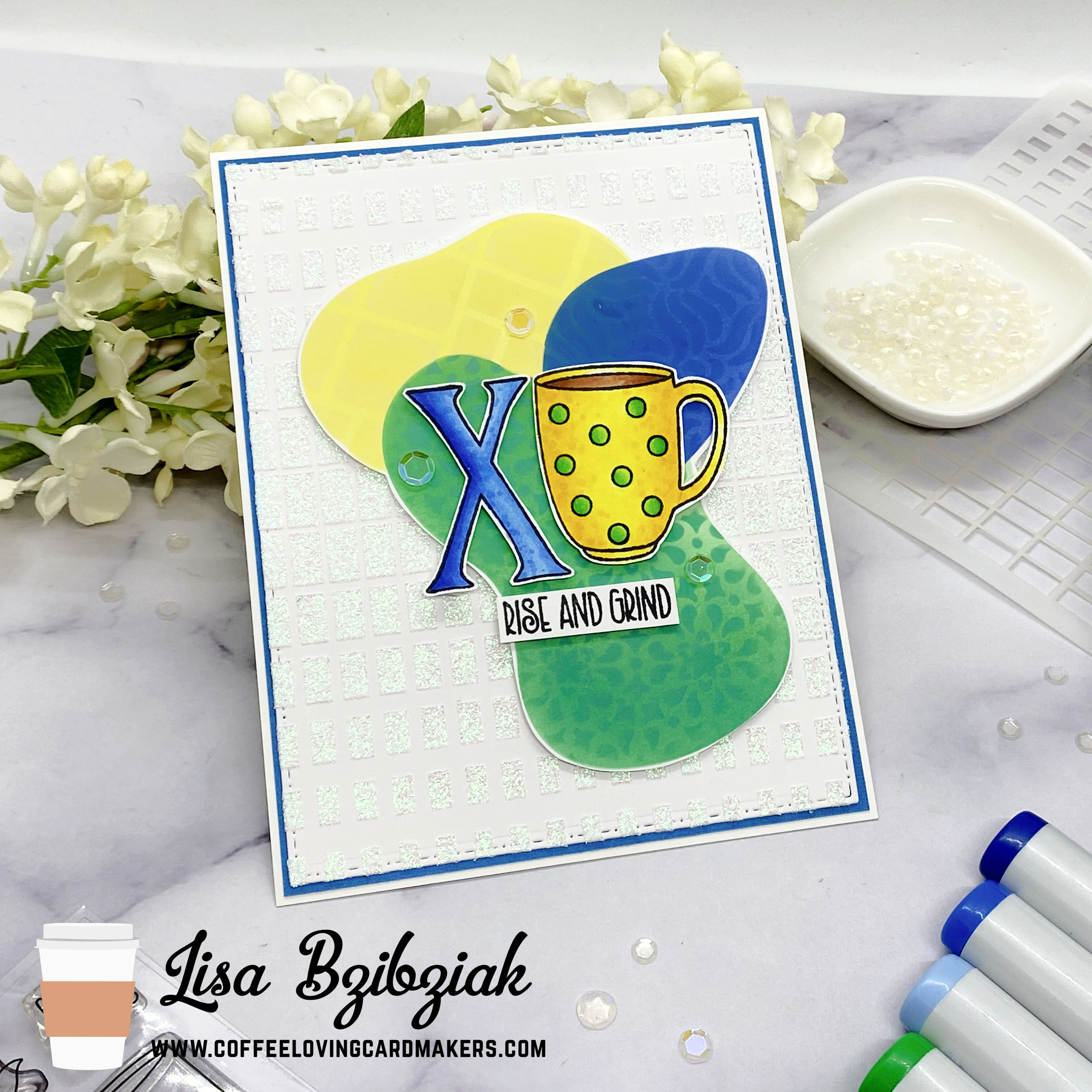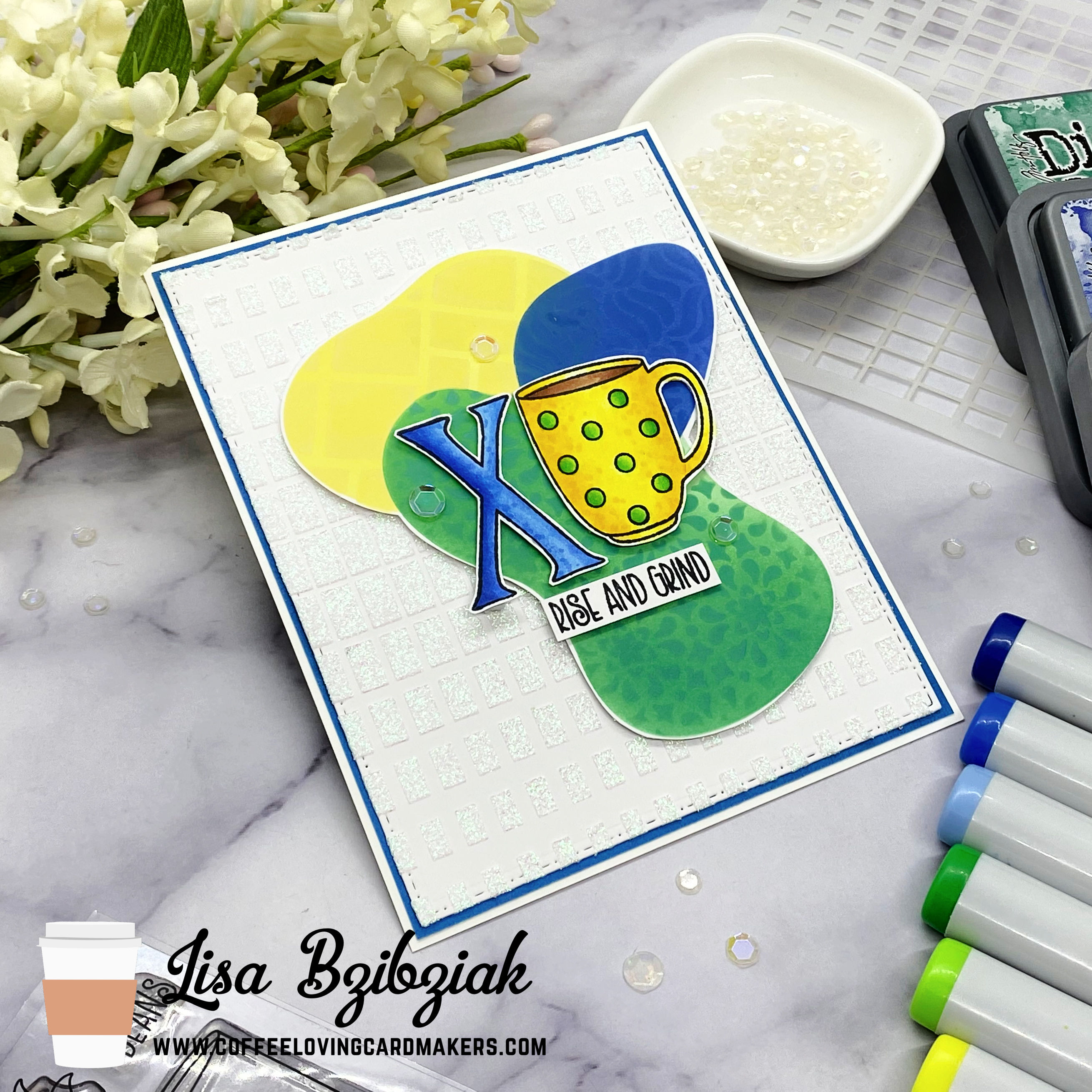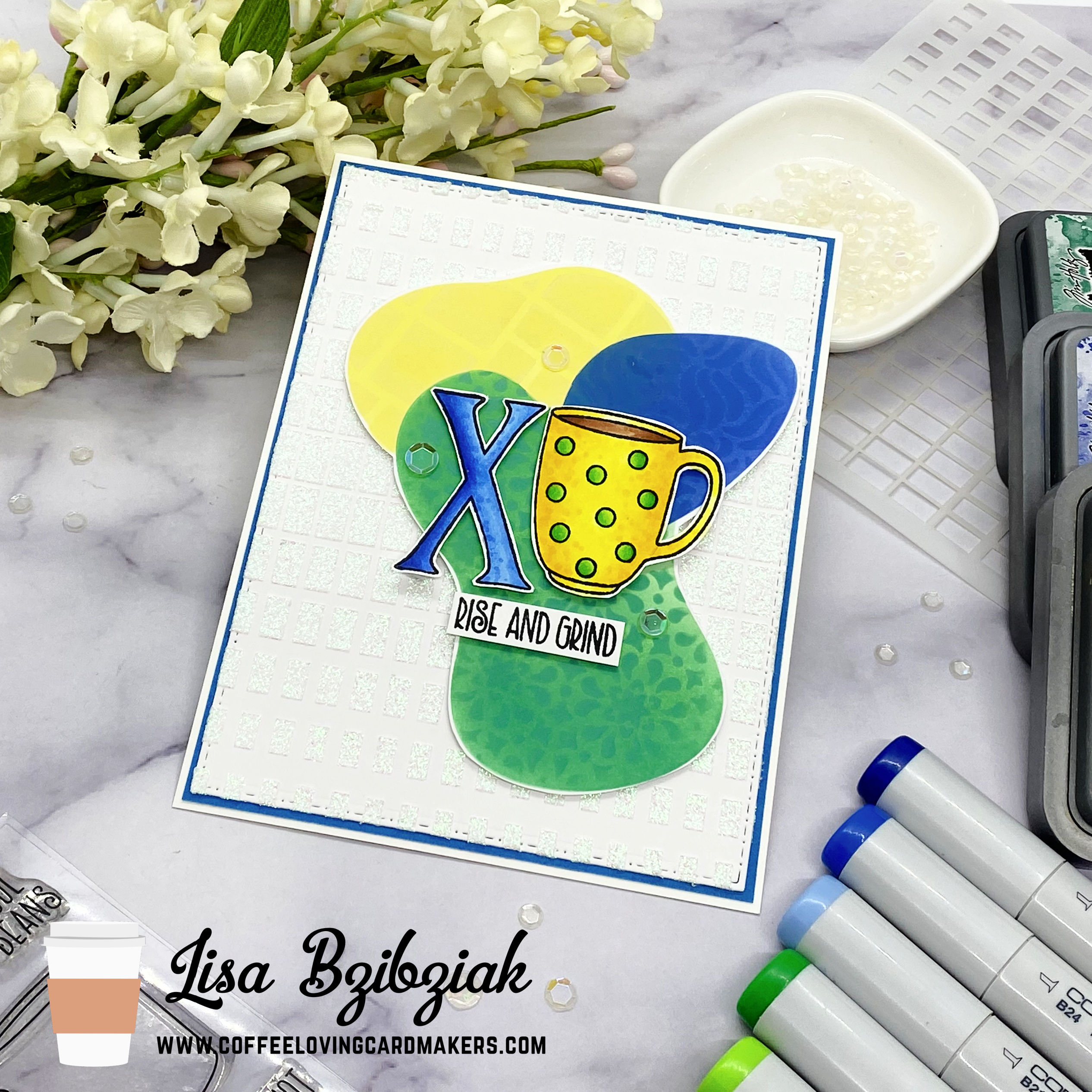 Then I stenciled three of the shapes from the Artsy Abstracts stencil set and added some more subtle pattern with the Squared Away, Paint Stroke Floral, and the Kaleidescope stencils. I cut the stenciled piece out and pop it up over the background to make the perfect background for the XO cup and sentiment from Brewtiful.