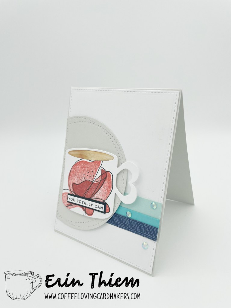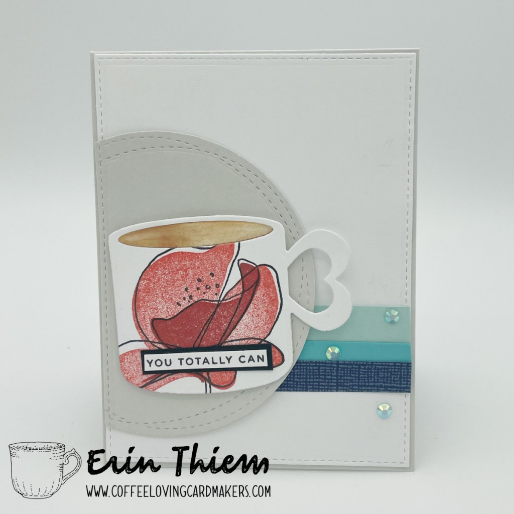 Good morning!  Welcome to another Creative Chaos, I’m Erin, a sometimes blogger, constant crafter with a very messy craft space (thank goodness I don’t share my space with anyone else in my household).  Today’s card is inspired by the current Fusion Card Challenge.  I had an extra stamped image of the Concord & 9th flower and I turned it into a coffee mug with the CAS-ual Fridays die.  I added a Simon Says sentiment, some card stock strips, some Pink Fresh Studio bling and a couple of MFT dies to round out today’s card.  Hope your weekend has some crafty time (skip the cleaning).