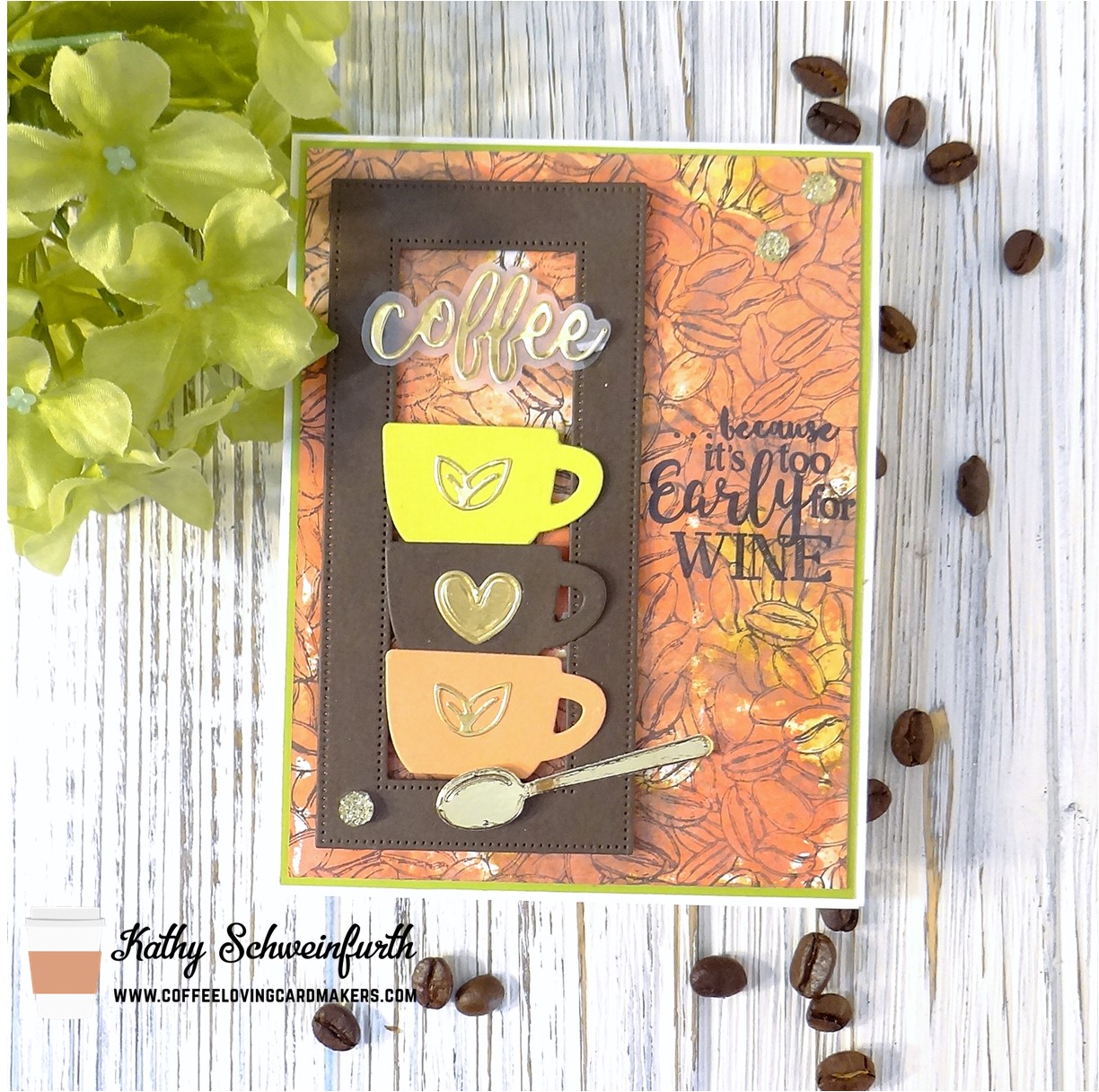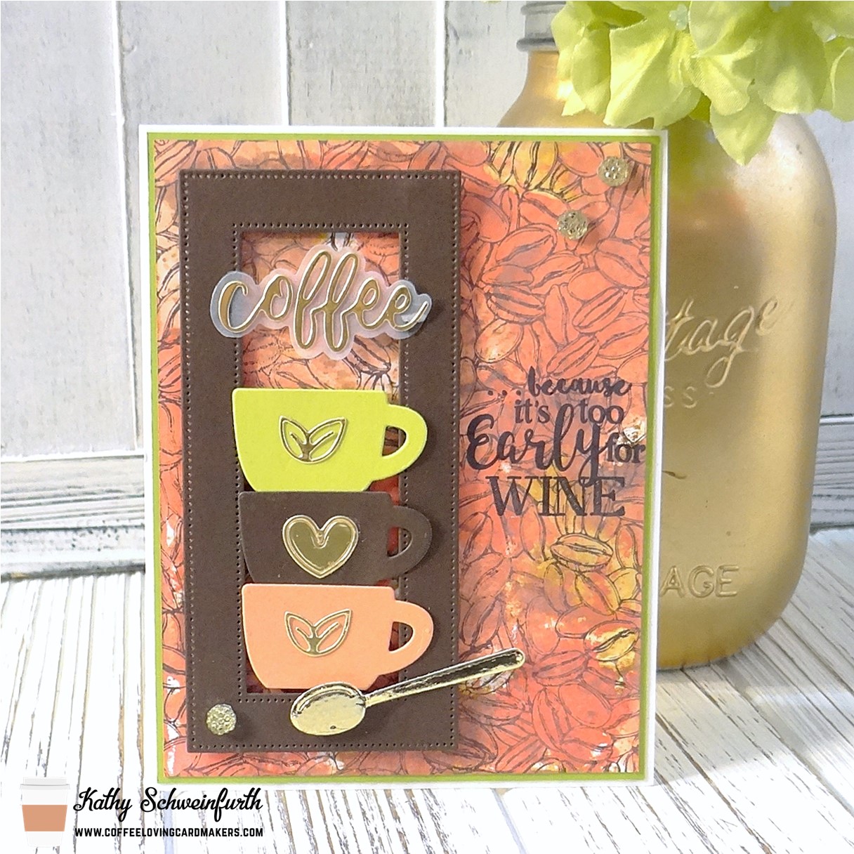 For my card, I first created the background with distress oxide inks and water. I then stamped this fun Coffee Bean Background from Honey Bee Stamps and added the sentiment from SugarPea Designs The Perfect Blend. The colorful cup dies and sentiment (from my stash…can’t remember the brand) are framed with Divinity Designs Mini Slimline Pierced Frames.