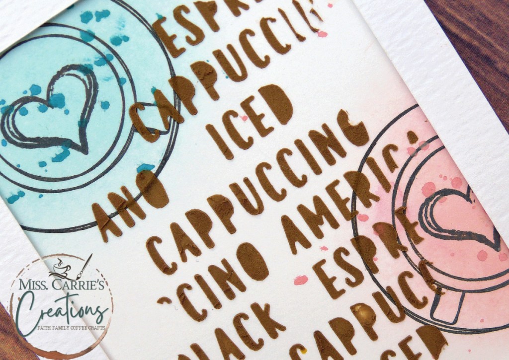 Once everything had dried, I attached a frame to the front of the card and called it complete. I truly love how this one turned out with the soft colors and coffee-colored phrases. With all the renovations taking place, I wasn’t able to make a video this time, but I will be sharing a live tutorial in my Facebook group.