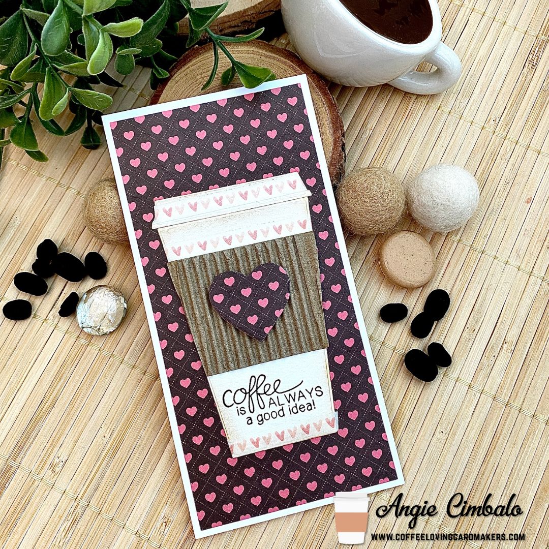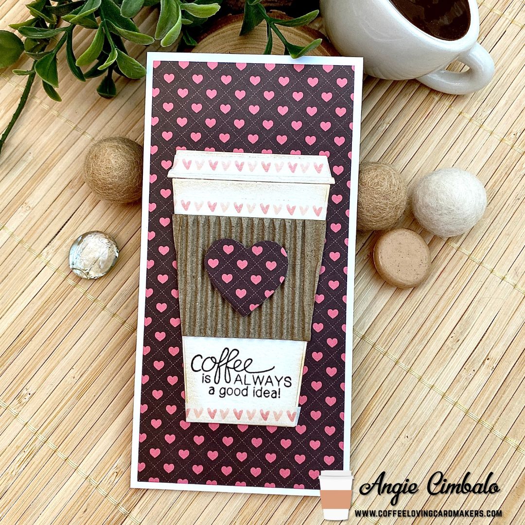 To make my card I die cut the cup and lid from watercolor card stock and inked the edges with tan ink. Next I die cut the center piece from corrugated card board and added it to the cup. The tiny pink hearts are actually a very thin washi tape. Next I stamped the sentiment directly onto the cup at the bottom. I added the cup to a piece of heart paper from my stash and also cut an extra larger heart with a heart die in my stash to place on top of the cardboard. The heart paper was cut to 2.75″ by 5.75″ and then matted onto a 3″ by 6″ mini slimline card base.