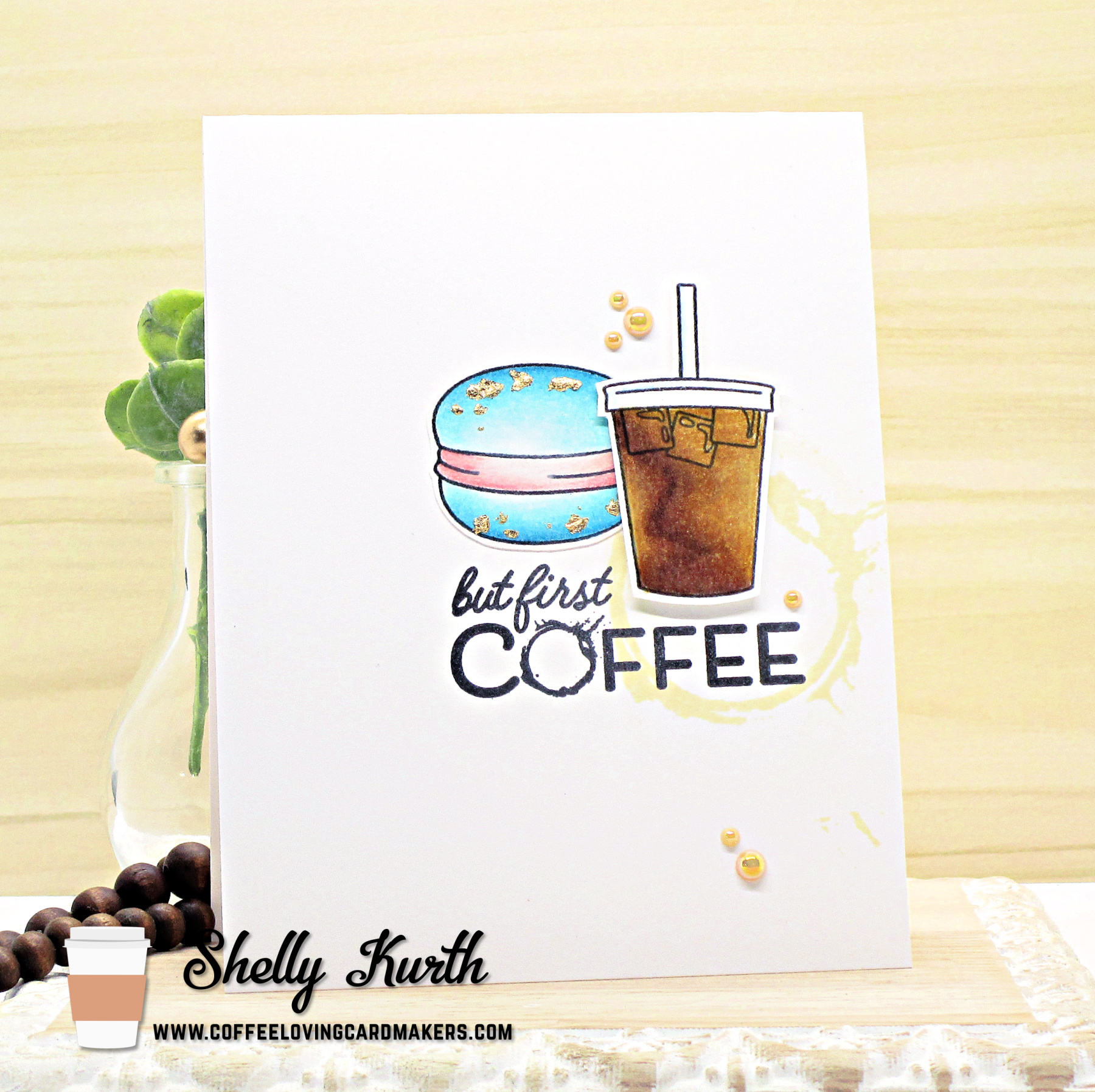 For today’s blend I’m using Super Sponsors Jaded Blossom, A Jillian Vance Design and a little touch of Trinity Stamps. For my card, I kept things simple. I did some coloring with colored pencils for the images, which I did add a little swirl with the ice coffee and a touch of gold flakes on the macaron. Fun, right?!…For the background I added some coffee stains in a light brown/tan ink and then stamped on the sentiment in black ink. To finish things off, a touch of pearls. Easy peasy, right?!…