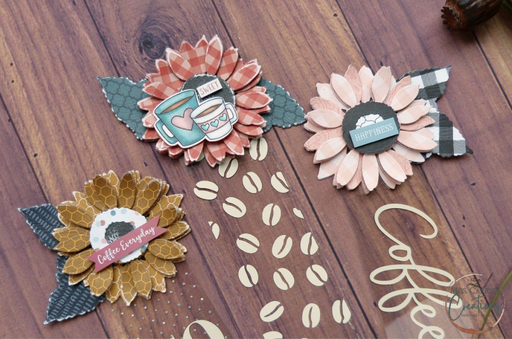 The other two sunflowers have simple sticker sentiments from Echo Park. If you are like me, you have quite a few coffee sentiments in your collection and this is a great way to use them up.