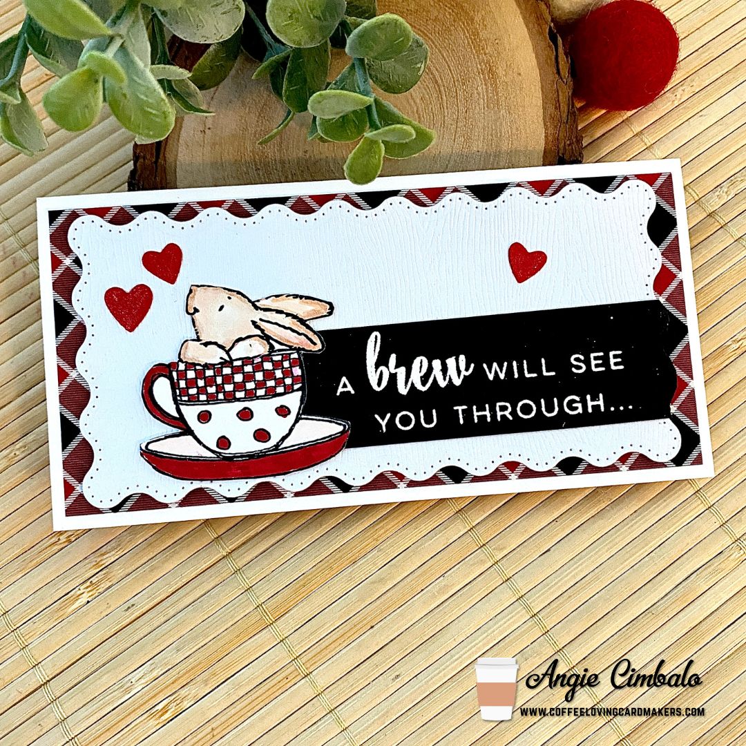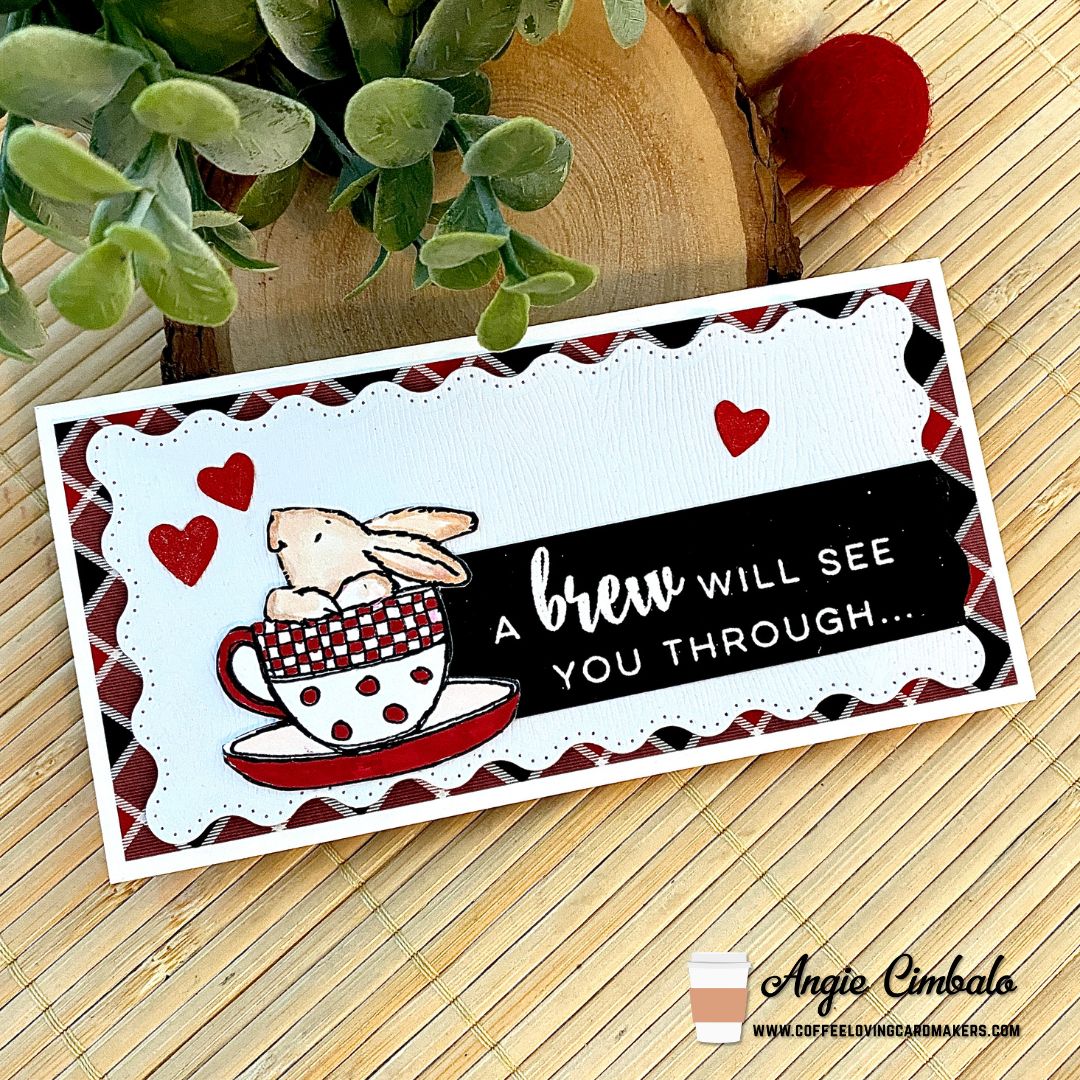 Hello and welcome to another “Second Cup Sunday” using a “Dare 2B Artzy” wavy slimline die, a “Right At Home” sentiment, and an image from “Penny Black.” The plaid paper is from “Brutus Monroe.”