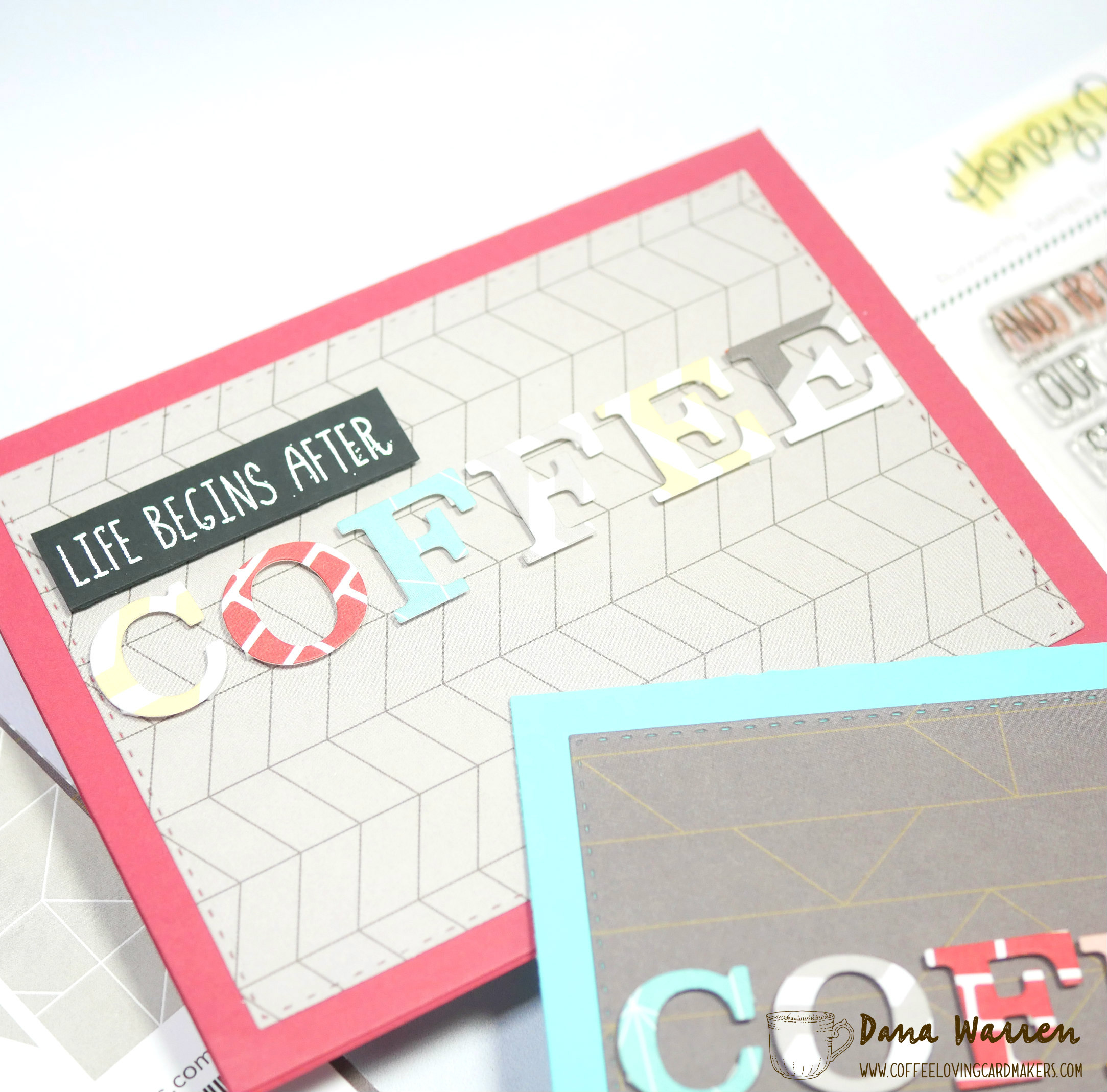 Next, I picked out my background pattern and cut it with a stitched rectangle. Then I used foam tape to adhere the coffee sentiment. From the Honey Bee Stamp Perfect Blend stamp set, I heat embossed Hug in a Mug on black card stock. As I was doing this I happened to glance at the rest of the letters I die cut and I wondered do I have enough to spell out another coffee? And if I do I can just heat emboss another sentiment while I’m at it! I did have enough letters so I did up another sentiment that says Life Begins After, and I decided to go ahead and make another card, rather than waste the letters. The likely hood of me using any saved letters would be slim, so might as well do it now!! LOL!