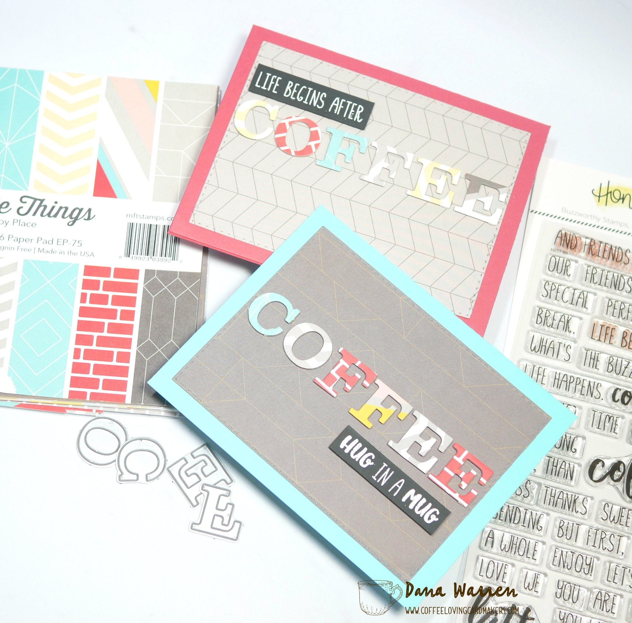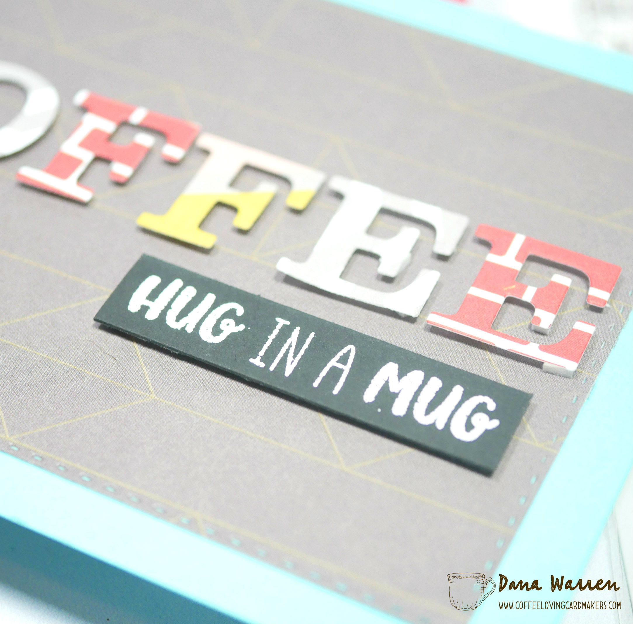 I started my card with some old alphabet dies from the now-closed Winnie & Walter and picked out a graphic pattern paper pad from My Favorite Things. I picked out several patterns and die cutted a lot of letters to be able to spell out coffee.