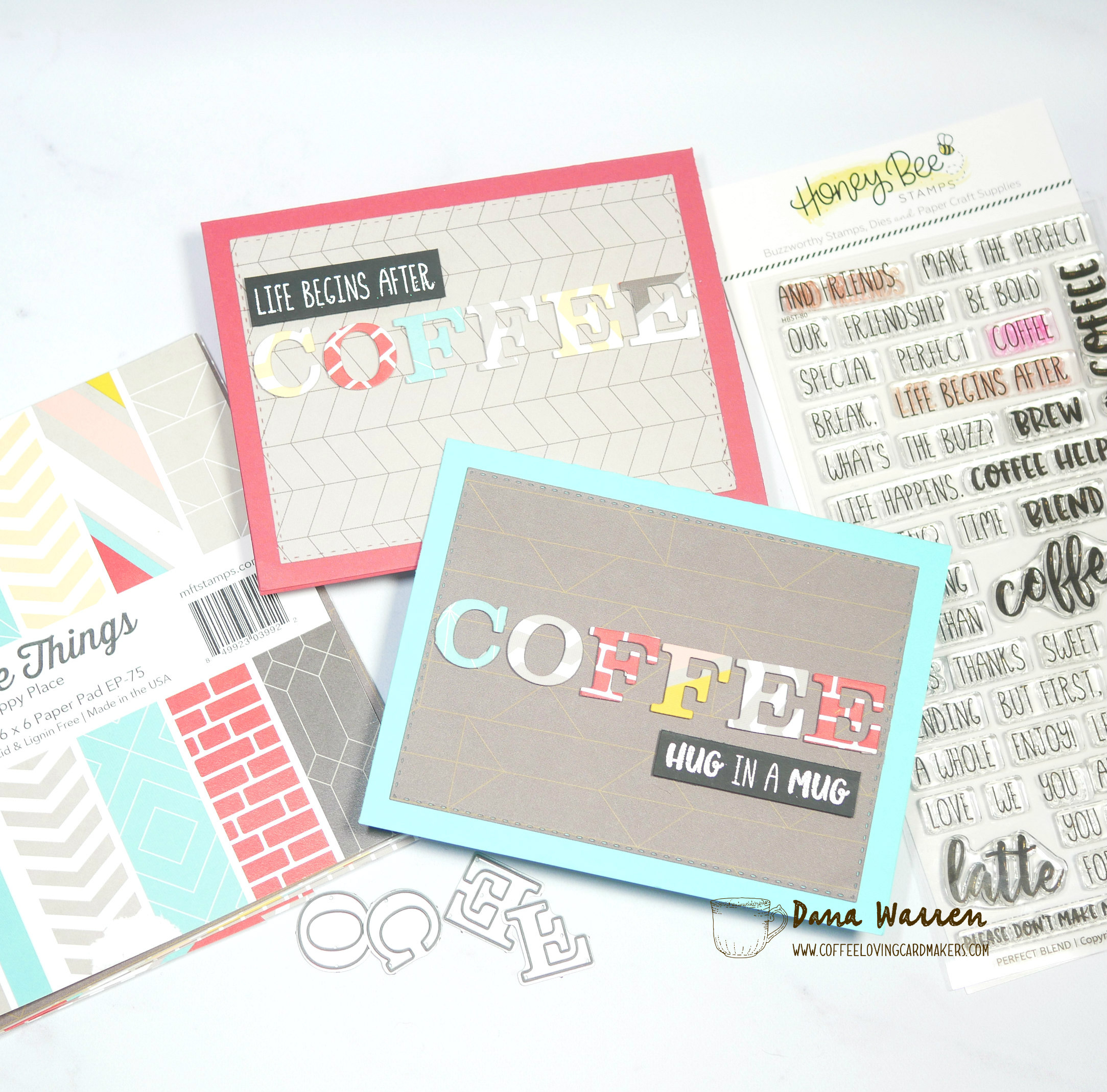 Next, I picked out my background pattern and cut it with a stitched rectangle. Then I used foam tape to adhere the coffee sentiment. From the Honey Bee Stamp Perfect Blend stamp set, I heat embossed Hug in a Mug on black card stock. As I was doing this I happened to glance at the rest of the letters I die cut and I wondered do I have enough to spell out another coffee? And if I do I can just heat emboss another sentiment while I’m at it! I did have enough letters so I did up another sentiment that says Life Begins After, and I decided to go ahead and make another card, rather than waste the letters. The likely hood of me using any saved letters would be slim, so might as well do it now!! LOL!