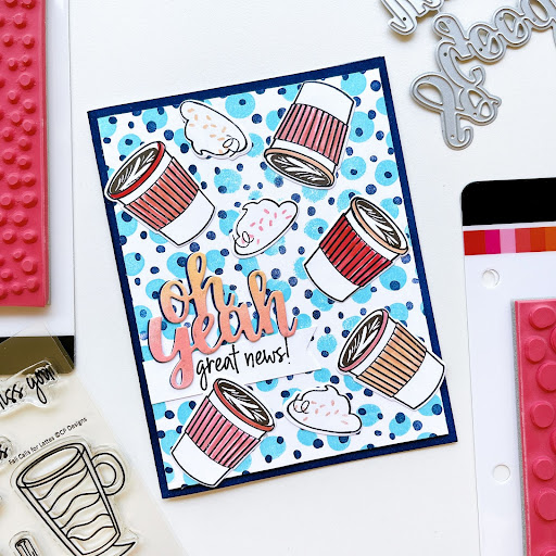 For the sentiment, I created a banner to stamp “great news” and then grabbed the Oh So Good Word Dies. I did a light ink blend of Apricot and Do-Si-Do on my paper before cutting out the “oh yeah”. I did this with a second layer inked in Juniper Mist.
