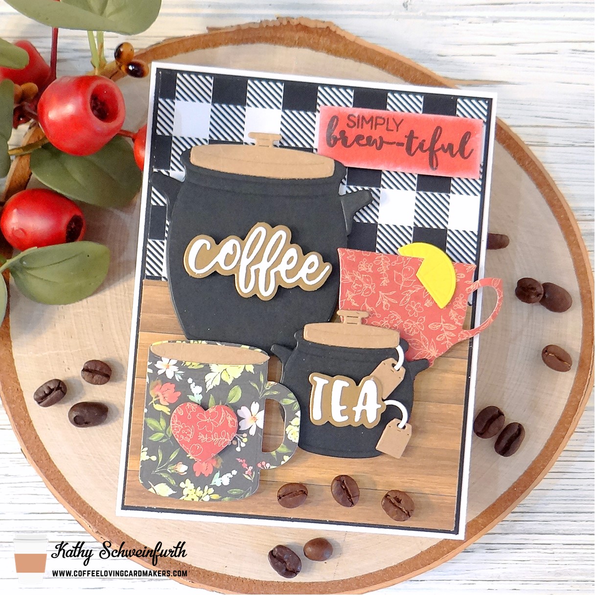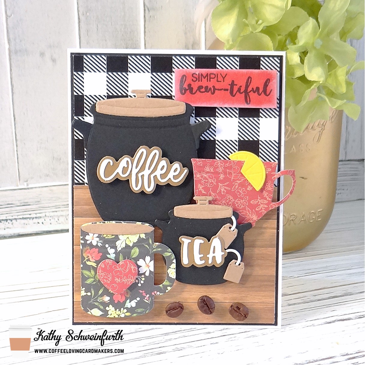 For my card, I layered pattern papers from Carta Bella Welcome Home 6×6 pad. These cute coffee and tea crock pots are Hero Arts Kitchen Crocks; the words are Honey Bee Stamps Perfect Blend Dies. The coffee and tea mugs were cut from the Welcome Home pattern paper using Divinity Designs Cups & Mugs dies and the mini tea bags from Divinity Designs Mini Cups & Mugs dies.