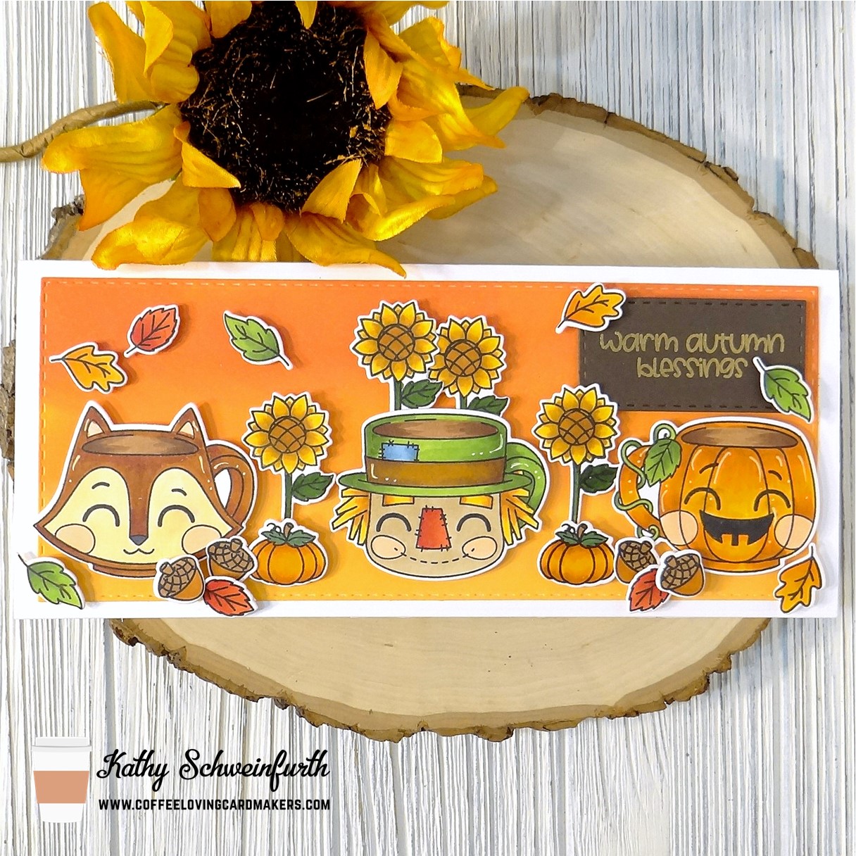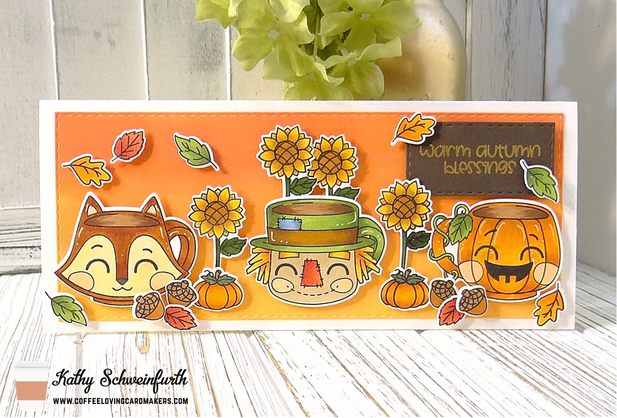 For my slimline card, I cut white cardstock with Pink & Main Stitched Slimline Dies and used an Ergonomic Blending Brush to blend Distress Oxide Ink/Pads: Mustard Seed, Ripe Persimmon and Crackling Campfire.  I Copic colored these fabulous images and gold embossed the sentiment on dark brown cardstock cut with Pink & Main Stitched Rectangles Set 1.