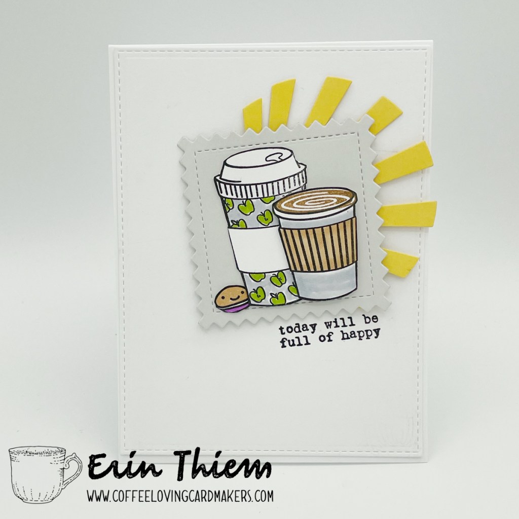Hello, Erin here, for another Creative Chaos CAS coffee card (say that fast several times before coffee). For today’s card I took inspiration from the current MFT Sketch Challenge pairing a couple of MFT dies with Catherine Pooler coffee cups, Flora and Fauna sentiment, a cute little cookie from Paper Smooches and a sun burst die from Papertrey Ink. Today will be full of happy… hope you get some crafty time on your weekend agenda.