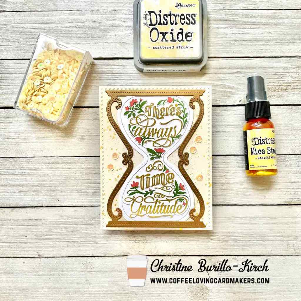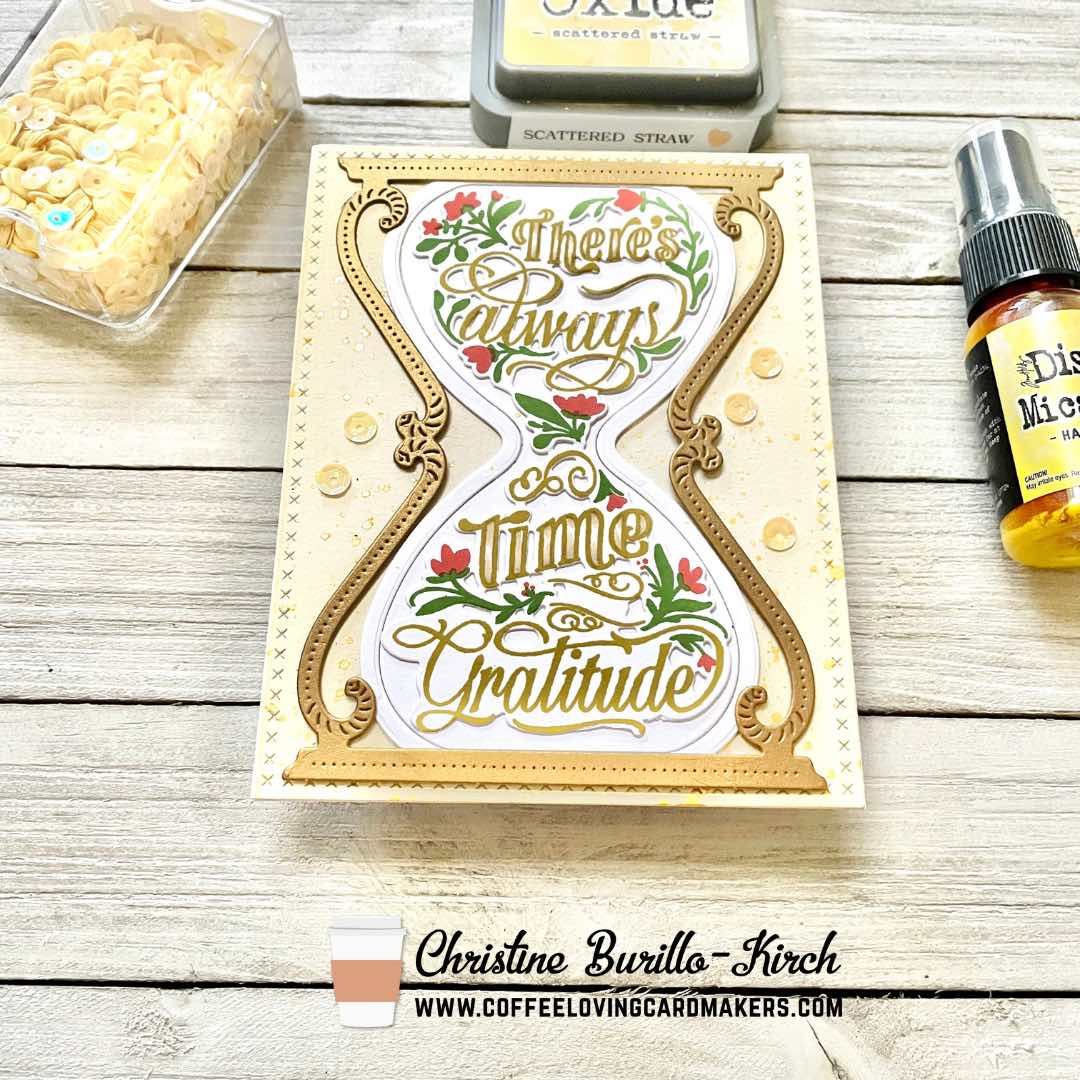 Last year The Greetery came out with an Hourglass Frame die and Hourglass Insert die that worked various additional stamp set and die sets that fit into the hourglass- I’m finally using it with a new stamp & stencil set Time for Gratitude Stamp + Stencil.