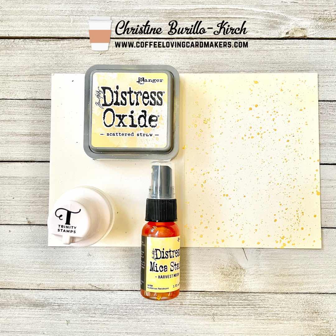 I wanted the card to have a fall vibe and so used soft yellows, bronze and poppy with a little green. First I wanted to create a light variated yellow background with metallic spackles- so I used a cream cardstock and ink blended some distress oxide scattered straw ink. I then dipped a paintbrush into the Distress Mica Stain in Harvest Moon and splattered that all over the panel- the harvest moon color is a very light gold like finish- thanks to the mica bits.