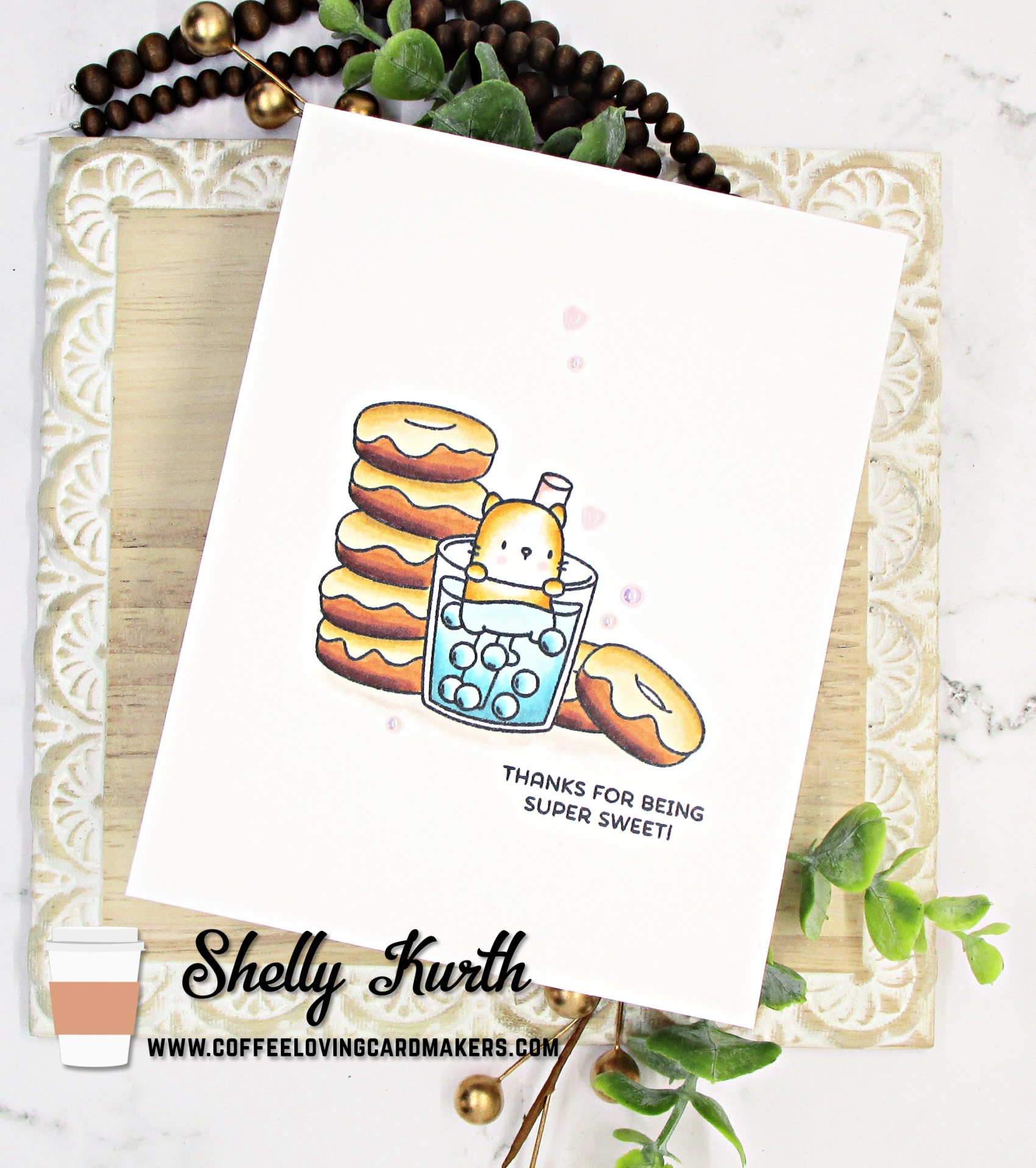 Products used: Mama Elelphant-Boba Tea stamp set, Mama Elephant-Donut Treats stamp set, Trinity Stamps-Double Bubble Jelly Drop Hearts, Trinity Stamps-Pearly Pink Baubles.