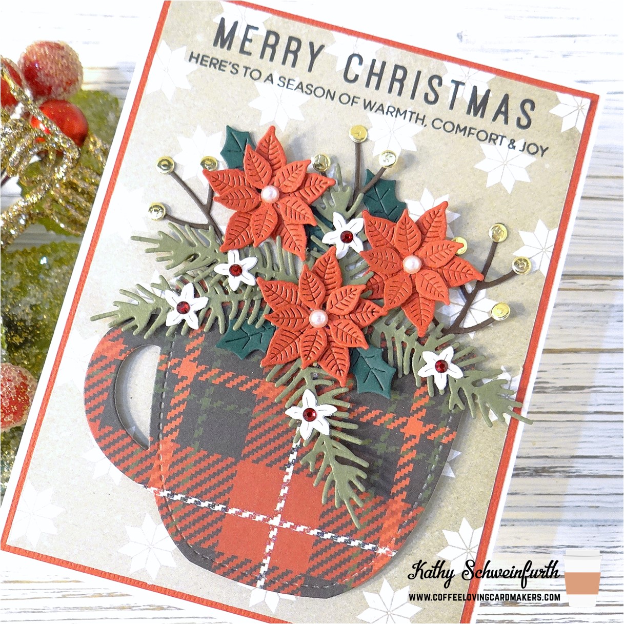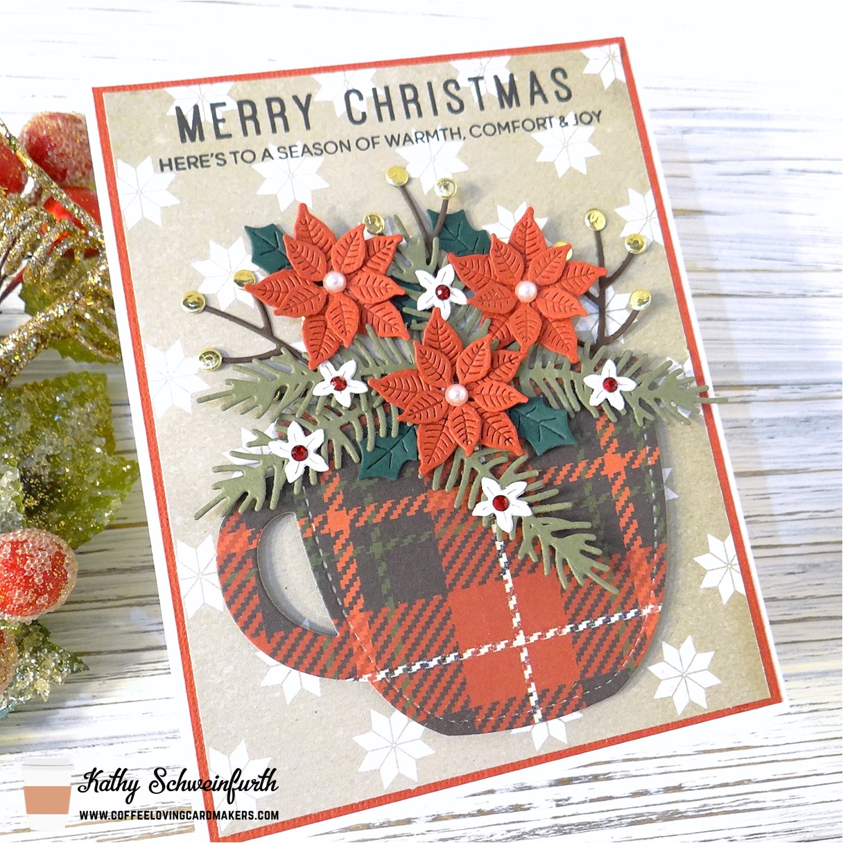 I used Lawn Fawn Outside In Stitched Mug die to cut Christmas plaid pattern paper. I then filled the cup with wonderful blooms and sprigs from Spellbinders Christmas Blooms.
