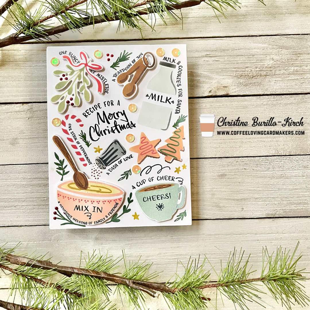 I then stamped the images around and on the ingredients as shown using black ink and green ink. I then made a second panel of stenciled images, mostly without stamping, and die cut them out with the Cooking Up Christmas die set. Placing some of the images propped up with adhesive squares really creates more interest than a single layer card.