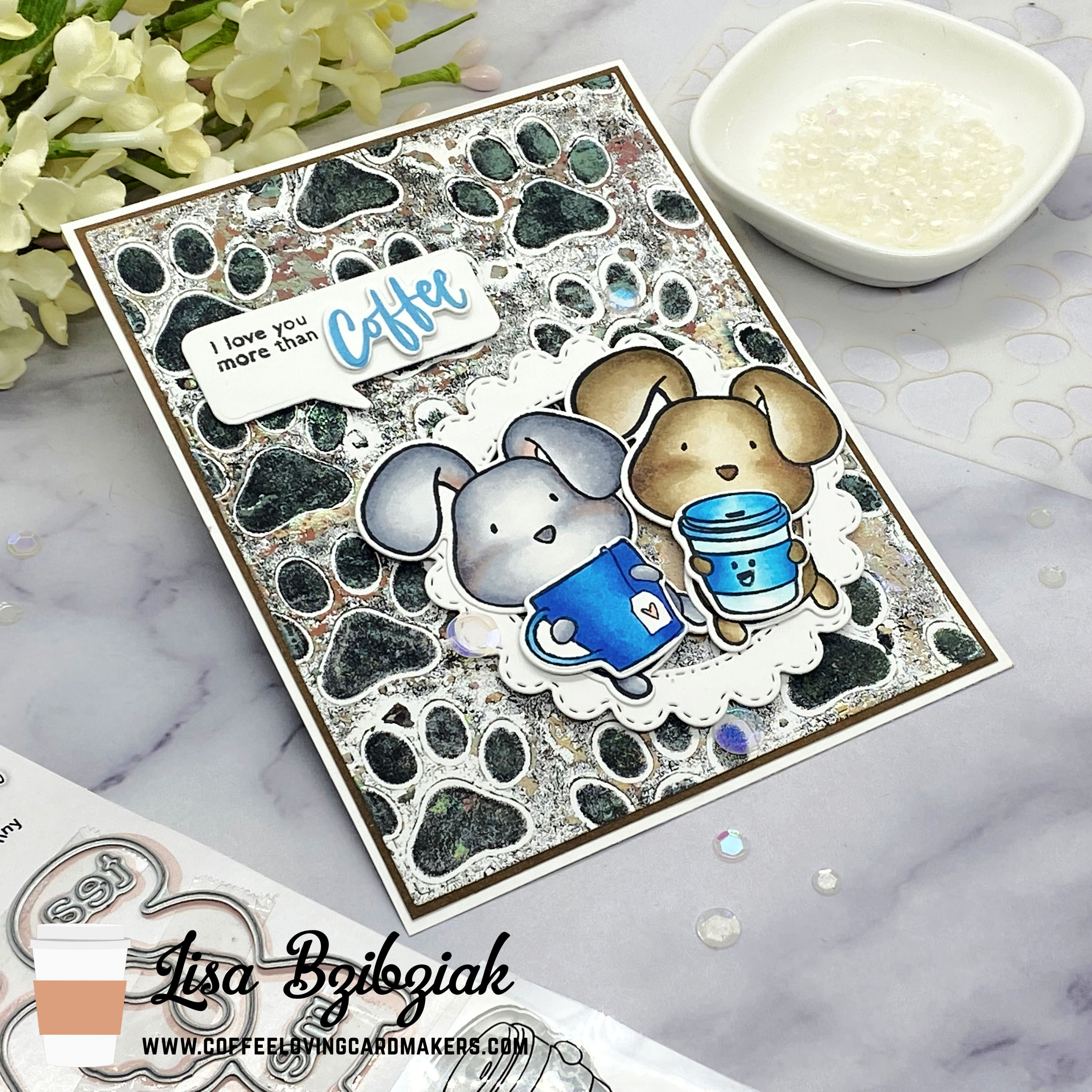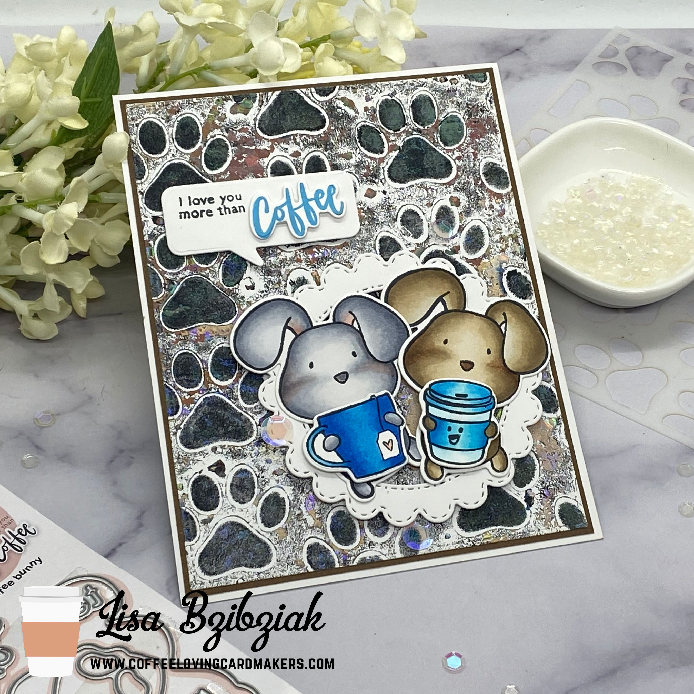 I used a gel print that I created with the Big Paws stencil from Miss Ink Stamps. I LOVE that the Coffee Bunny set comes with cups that have the paws drawn on so this little critter can appear to be holding the cups. And I love that this set comes with the dies.