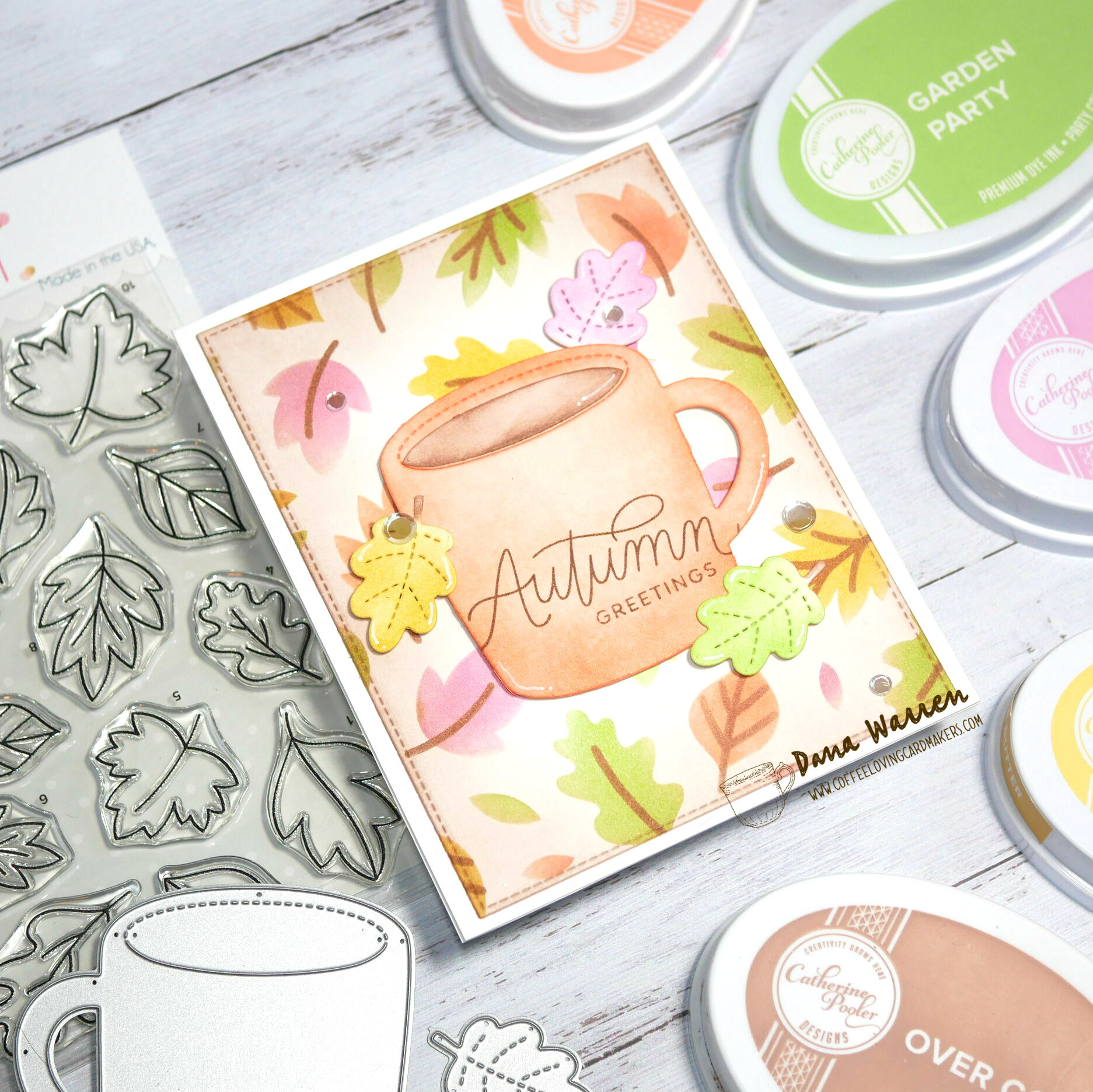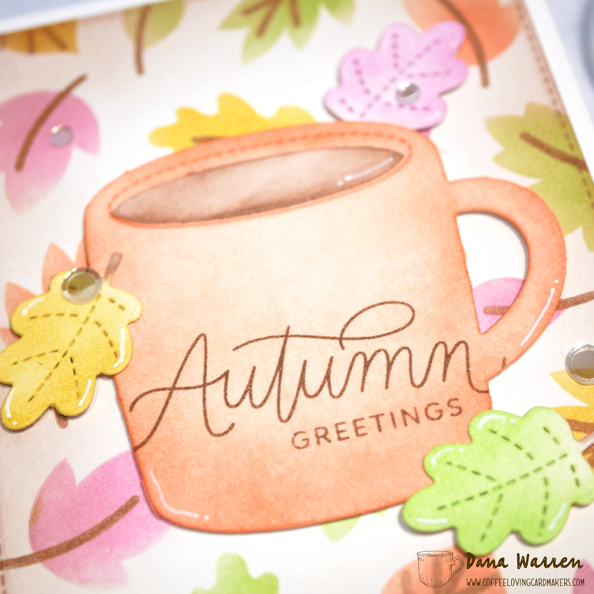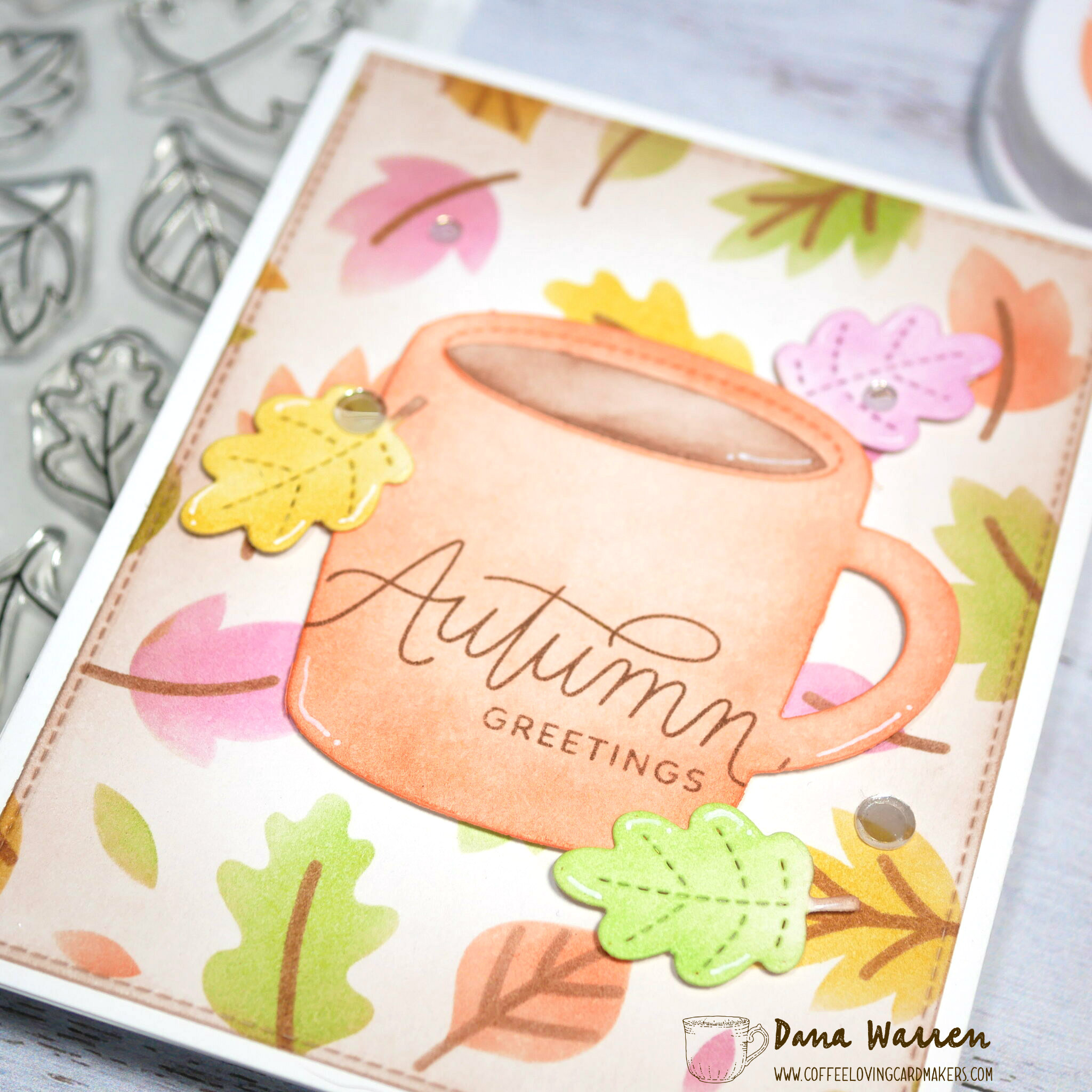 With a stitched rectangle die I cut the stenciled background and adhered it to a white card base. Then I pulled out the Falling Leaves stamp set and stamped the Autumn Greetings sentiment on the mug.