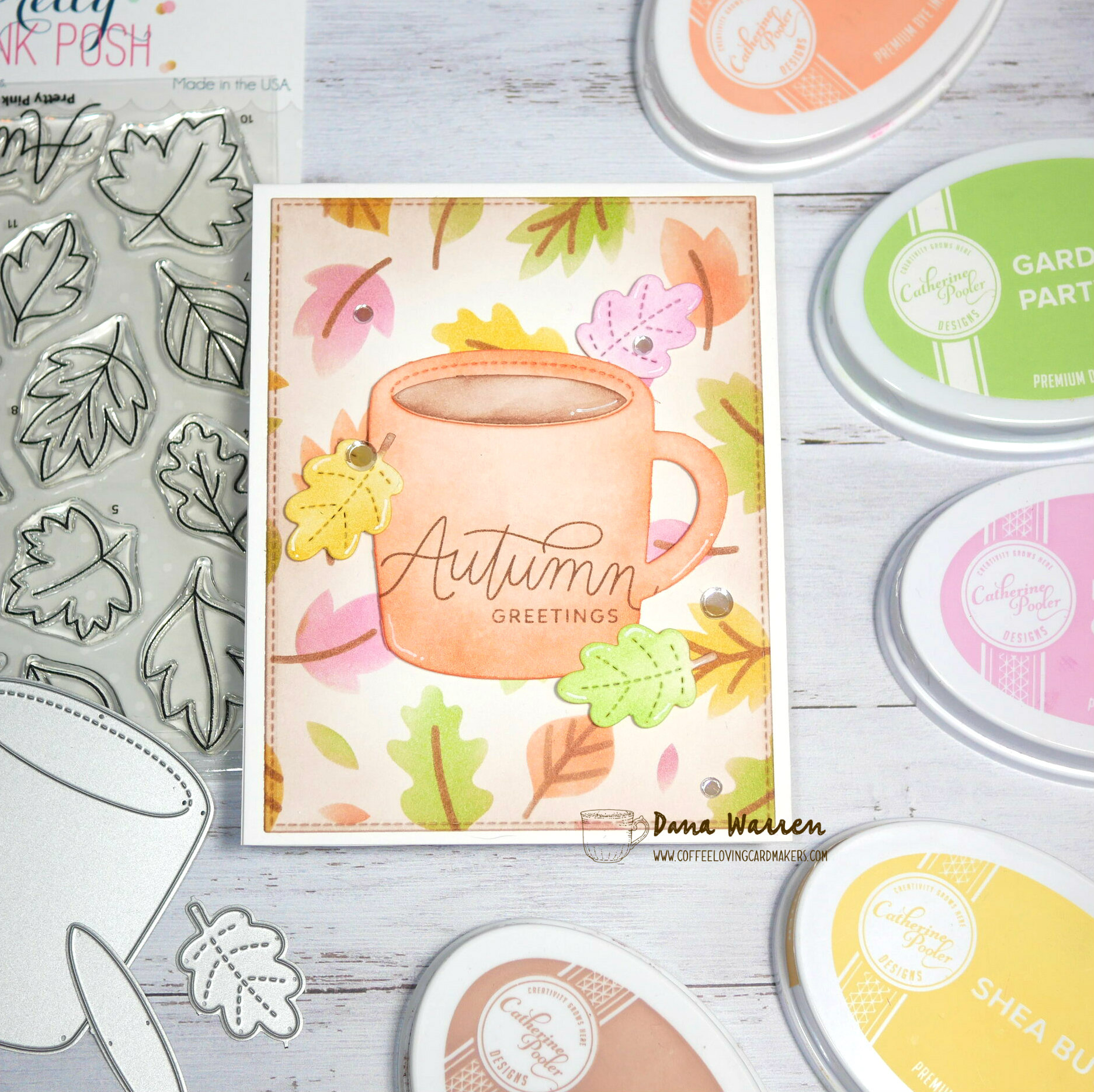 I recently picked up some coffee-themed products from Pretty Pink Posh newest release, of course, I had to pick up a few other items too! A couple of my extras included a fall-themed stencil and stamp set! So, I started my card using Layered Foliage Stencil and a few Catherine Pooler inks. The colors I used were Bellini, Garden Party, Pink Champagne, Shea Butter, and Over Coffee.