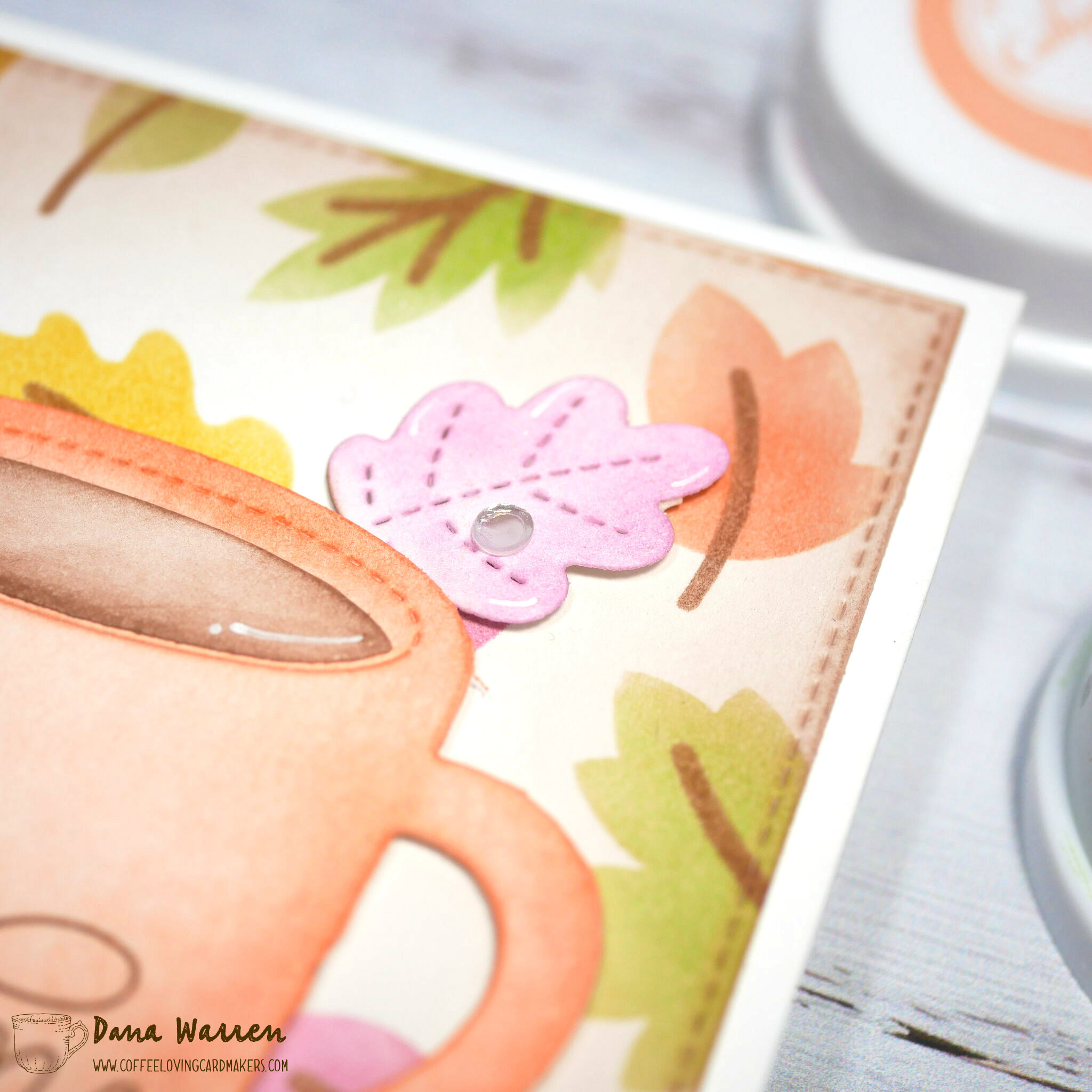 I added the mug and three leaves to the card with foam tape. Last, I used some clear flat sequins to add a little sparkle!