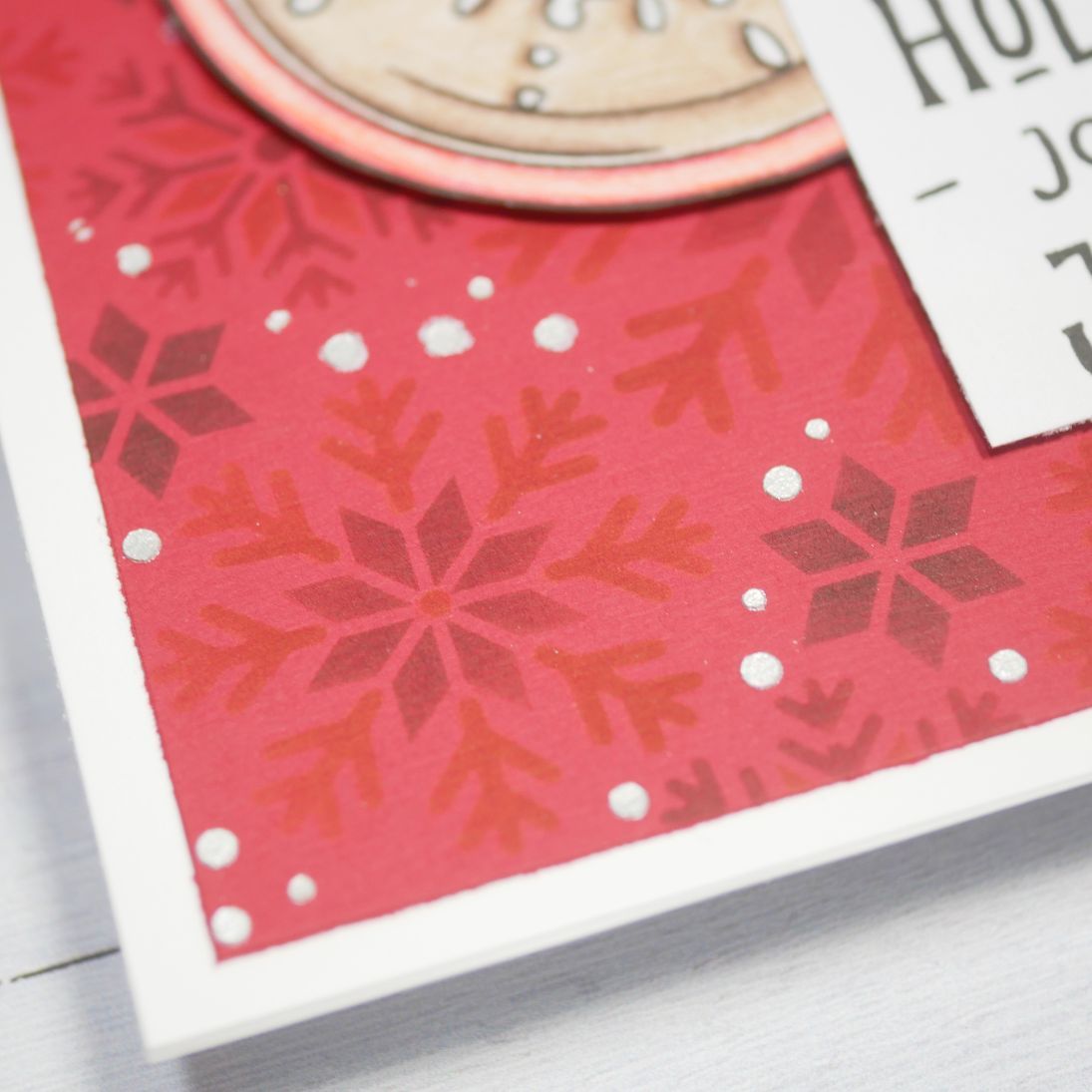When my background was dry I trimmed it down and adhered it to a white card base. With foam tape, I added the snowflake coffee cup and sentiment. Lastly, with a sparkle pen, I added a little sparkle to the coffee snowflake.