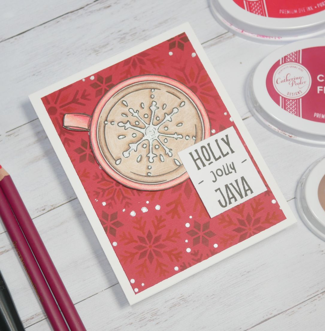 While the paste was drying I printed out the Cup of Cheer digital stamp set from Gracielle Designs along with the Holly Jolly Java sentiment. I used my Spectrum Noir Colored Pencils to color it up and then fussy cut it out.