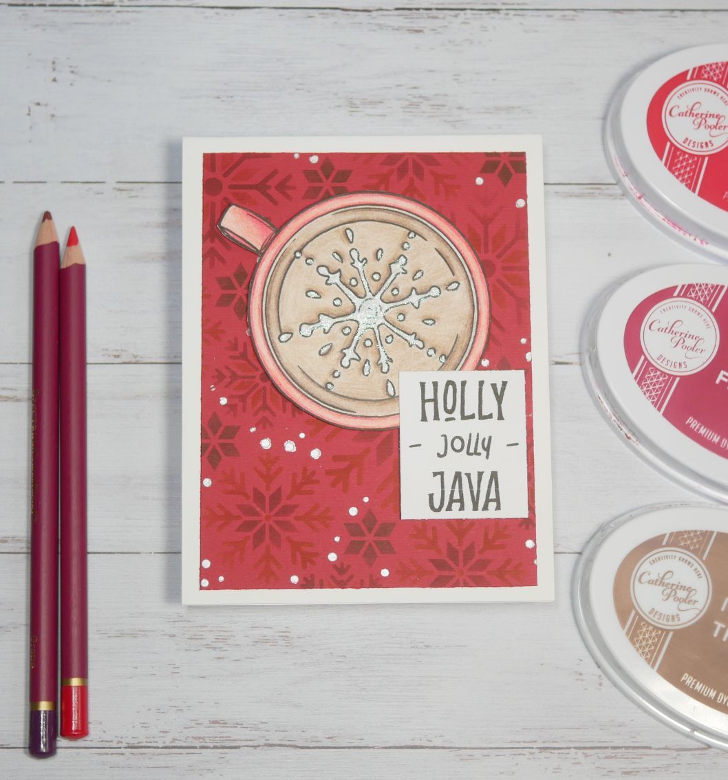 While the paste was drying I printed out the Cup of Cheer digital stamp set from Gracielle Designs along with the Holly Jolly Java sentiment. I used my Spectrum Noir Colored Pencils to color it up and then fussy cut it out.
