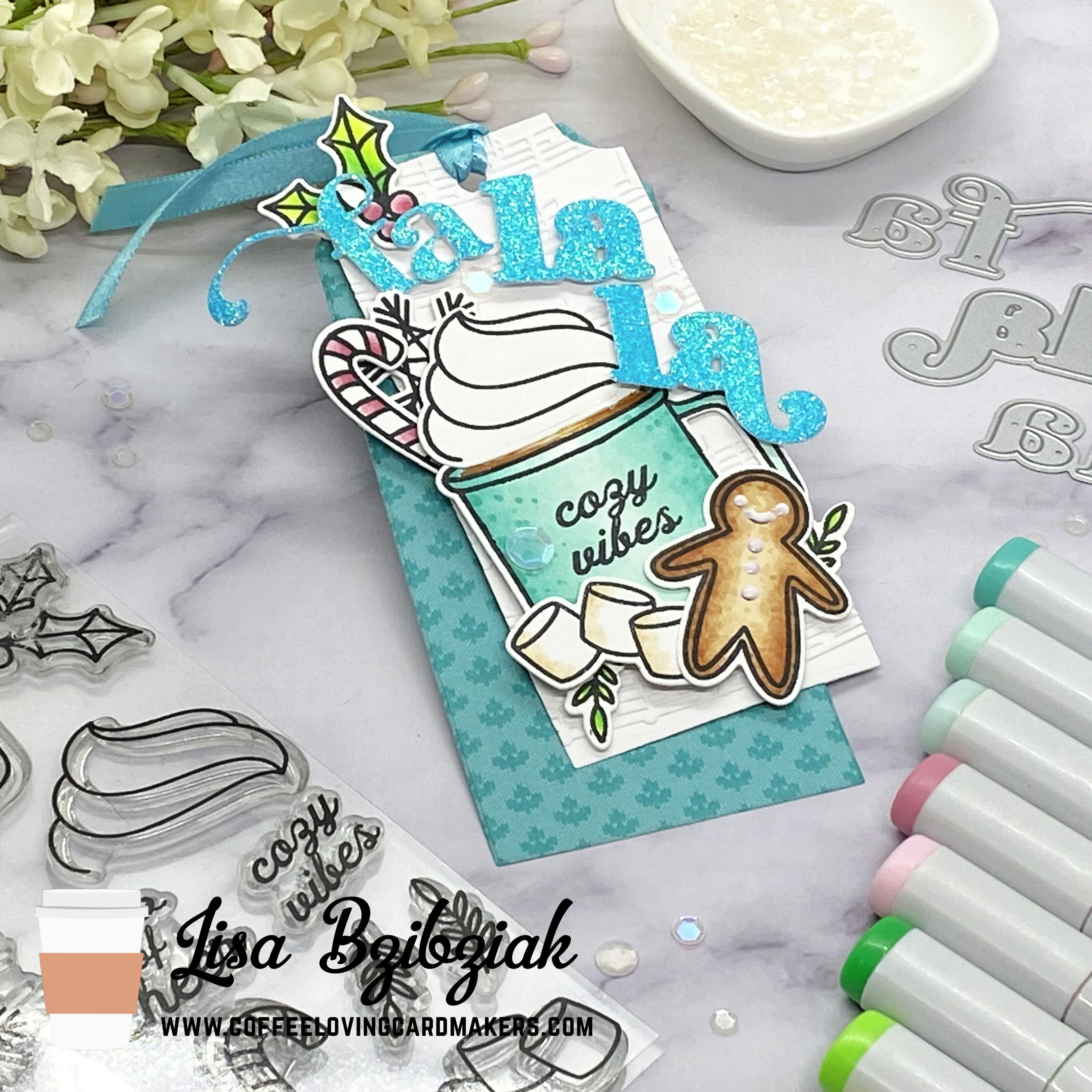 I started with a larger tag cut from some design paper and a smaller tag cut from white cardstock and embossed with a music note embossing folder. Then I stamped, die cut and colored all of the images from the Cozy Cuppa set and arranged them on the white tag.