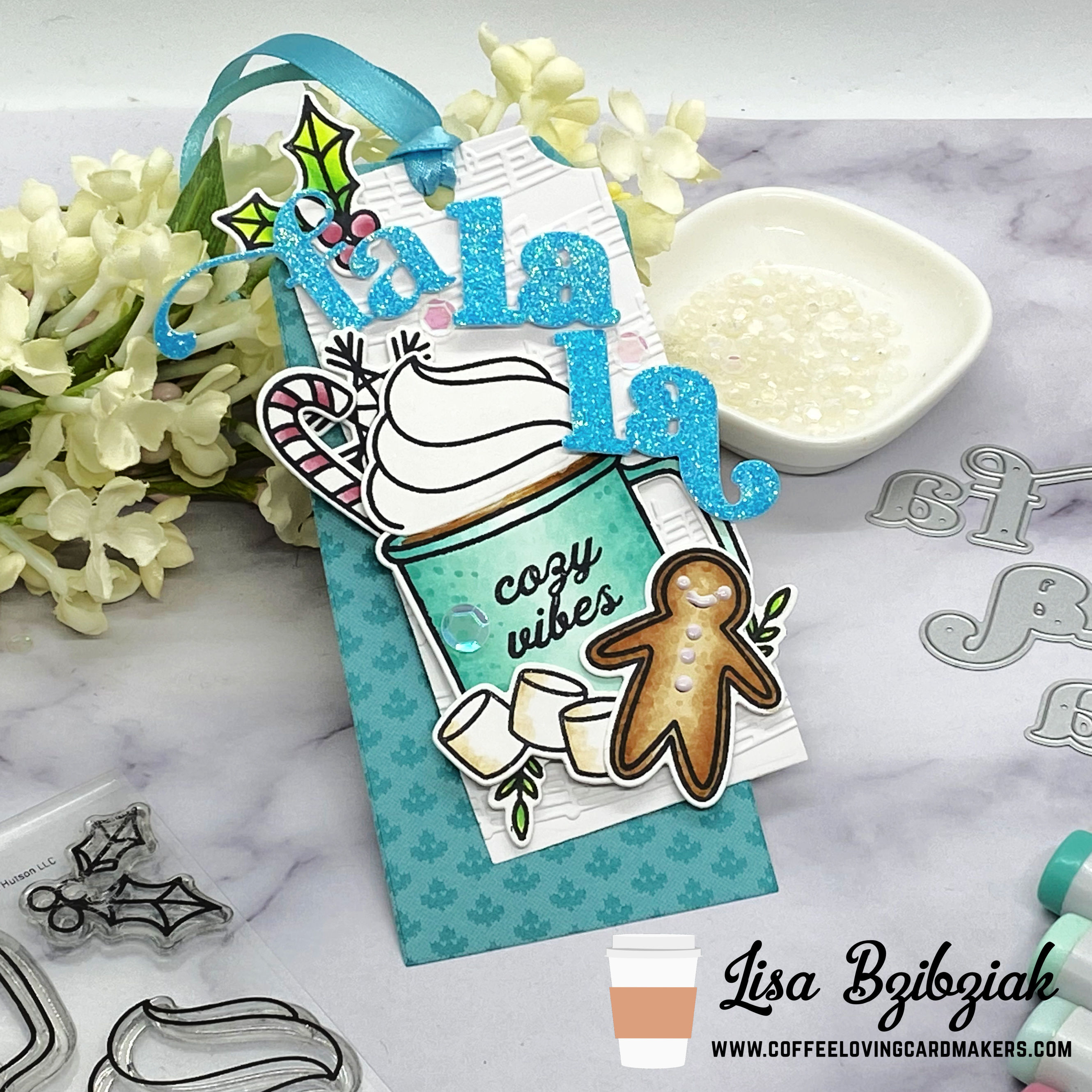 This year the theme is Christmas songs and you just pick a day that inspires you and create a tag! I picked Day 4, Deck The Halls and you should see the gorgeous tags Vera created for inspiration! It’s the Fa La La in Deck The Halls that gets me every time! So I took the opportunity to add a glittery Fa La La with the Fa La La Essentials dies! The font on this set is just the best and SO fun! I popped it up and added it to the card in a wonky design.
