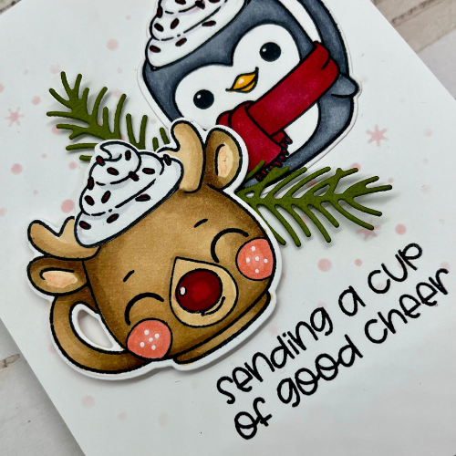 My card features a cute stamp set from Pink and Main. I enjoyed coloring the little holiday mugs with my Copic markers. I added a bit of pink in the background since pink seems to be the “in” color this holiday season.