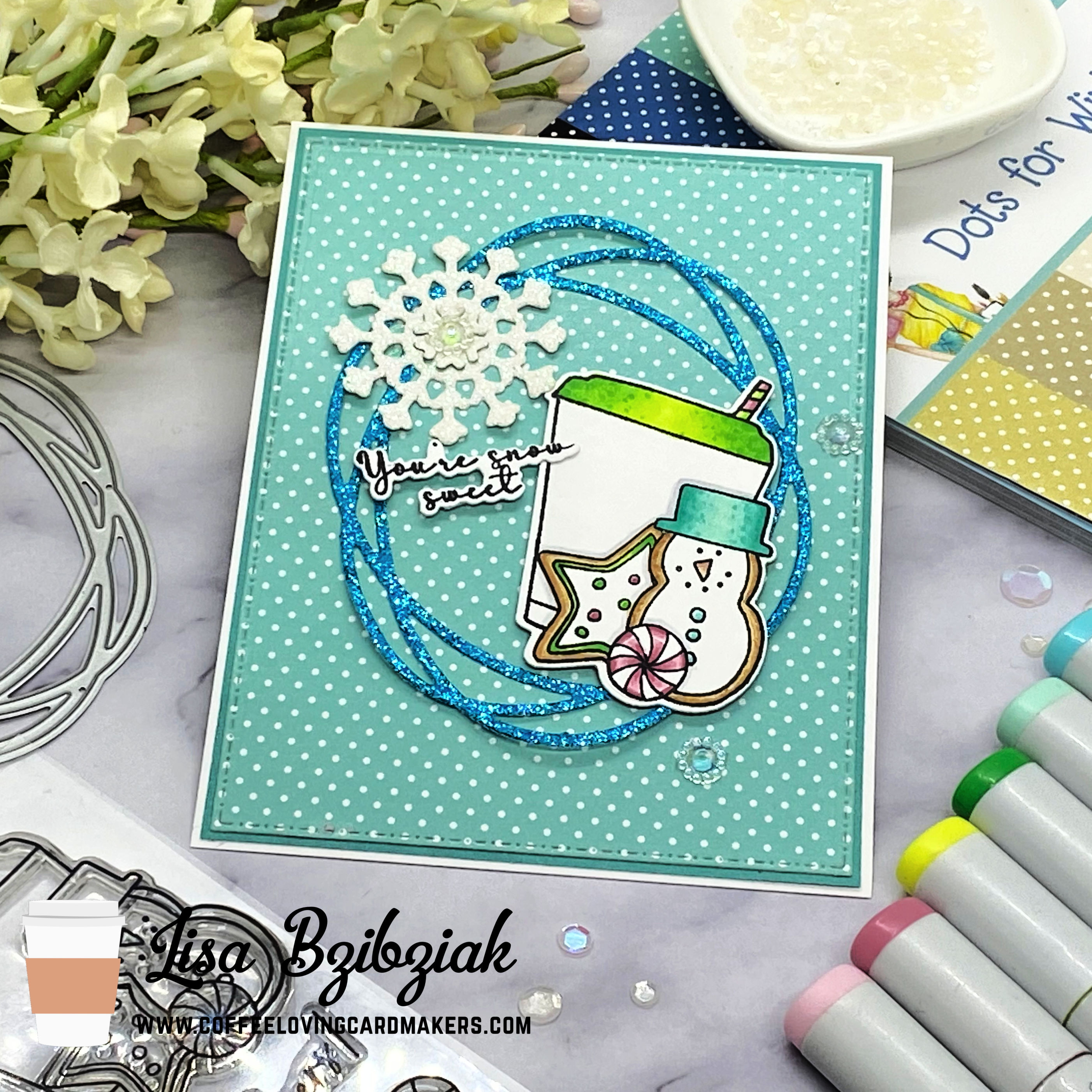 I stamped, die cut and colored my images, cut the paper using this die from AJVD and added that cool Connected Oval Die cut from Whimsy Stamps cut from the beautiful teal glitter paper from my quarterly Your Paper Insider box and added snowflakes that had been cut previously from white glitter paper.
