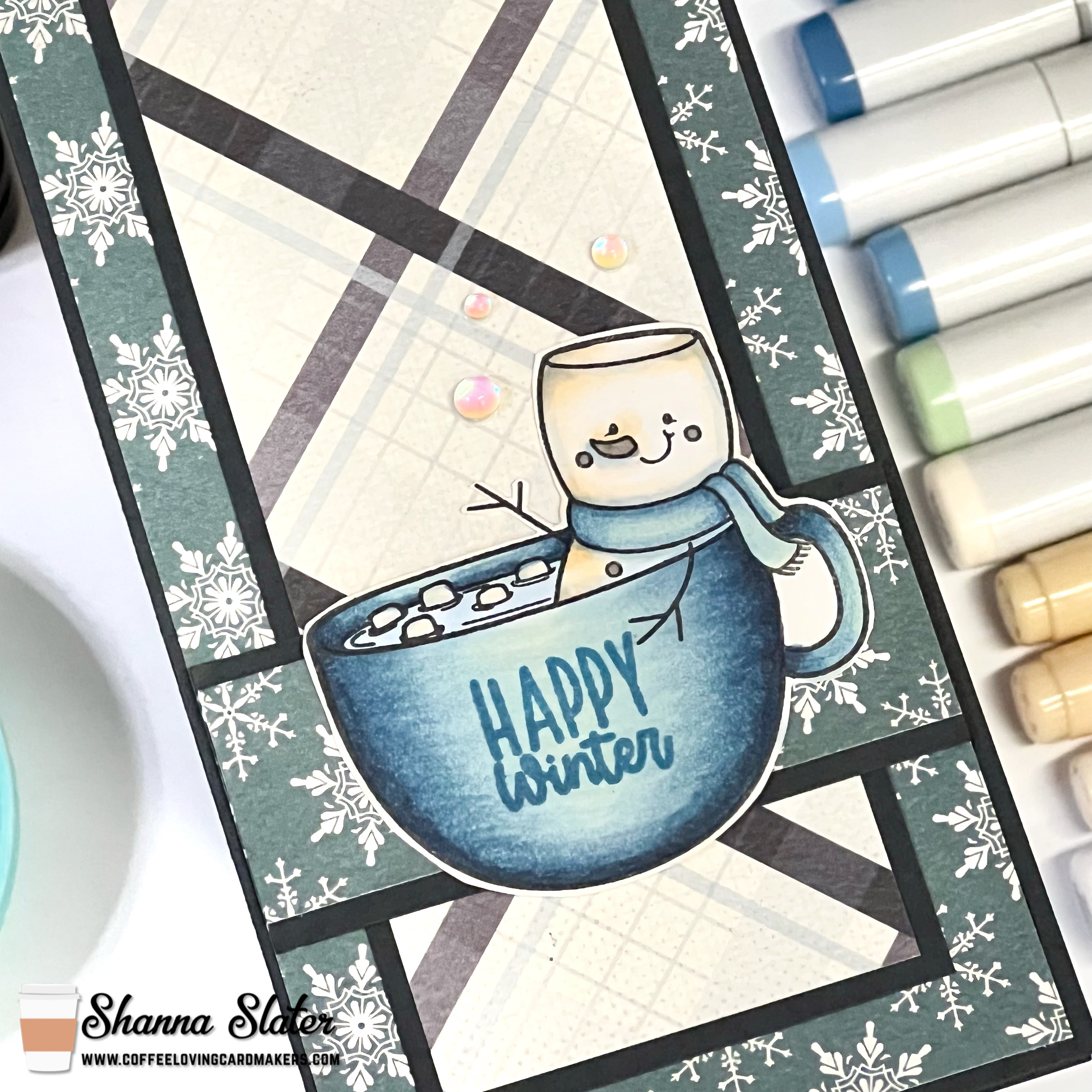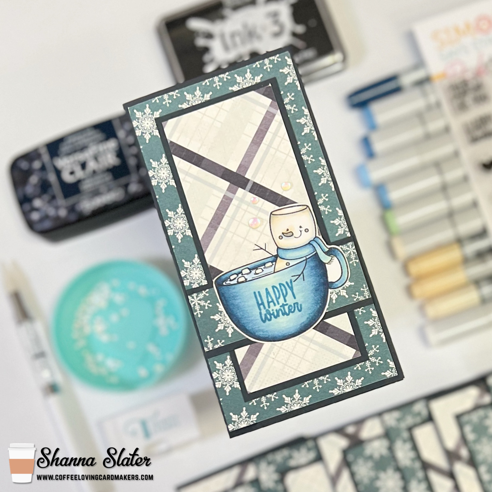 For coloring I used Copic markers and decided to step outside my comfort zone and attempt to color in a monochromatic color way. I started out by choosing blues I thought would work well with the papers—but ultimately needed to “toast” the marshmallows some so added some creamy tans to mix as well,…I guess true monochrome will have to be attempted another time LOL!