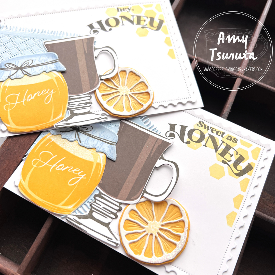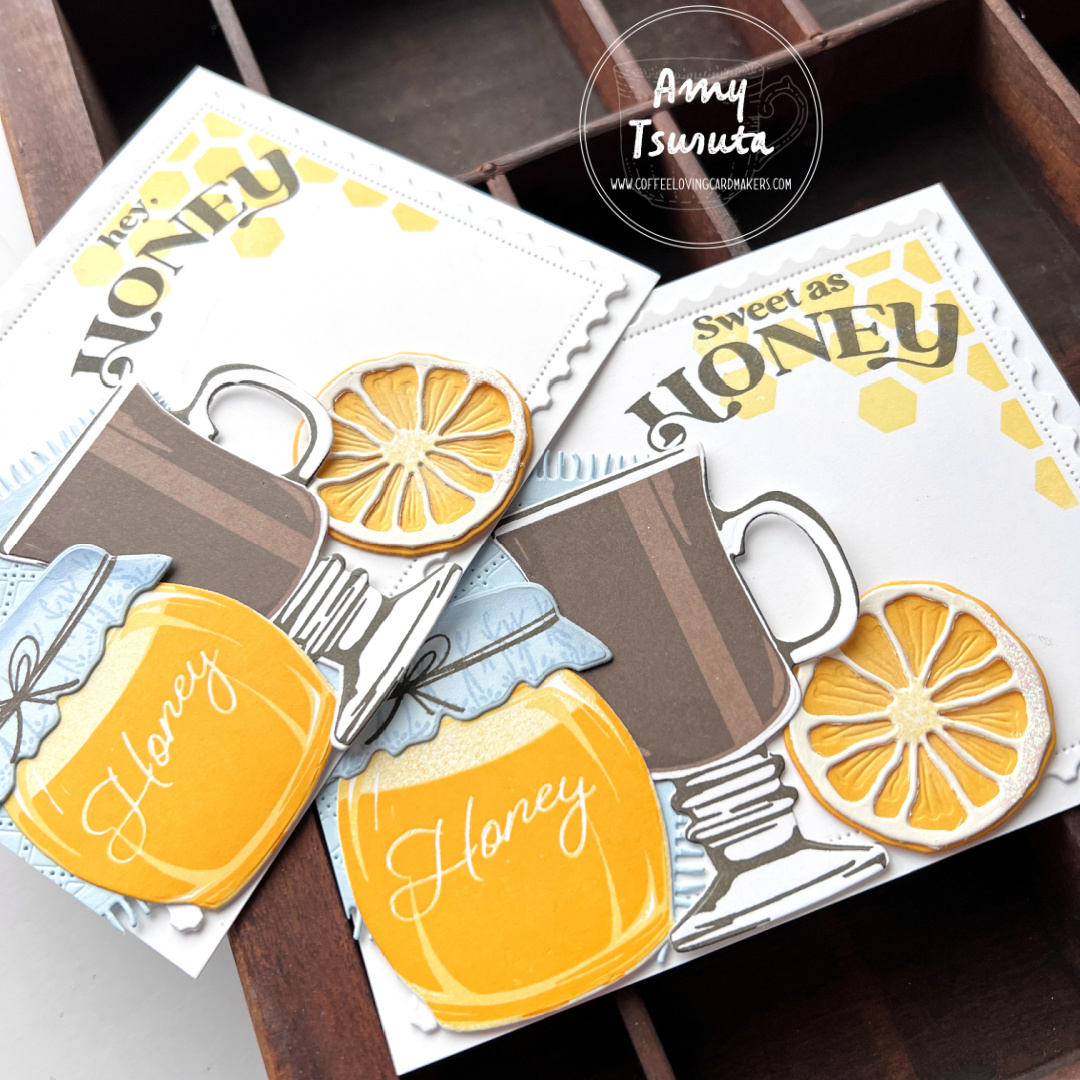 The sentiments were stamped in Cargo and the honeycomb image is in Tiara. The Coffee Cup Coaster and the Honey Jar Topper were cut from [retired] Reverse Confetti Mist. The Honey Jar Topper was inked up with Catherine Pooler ink – Tranquil.
