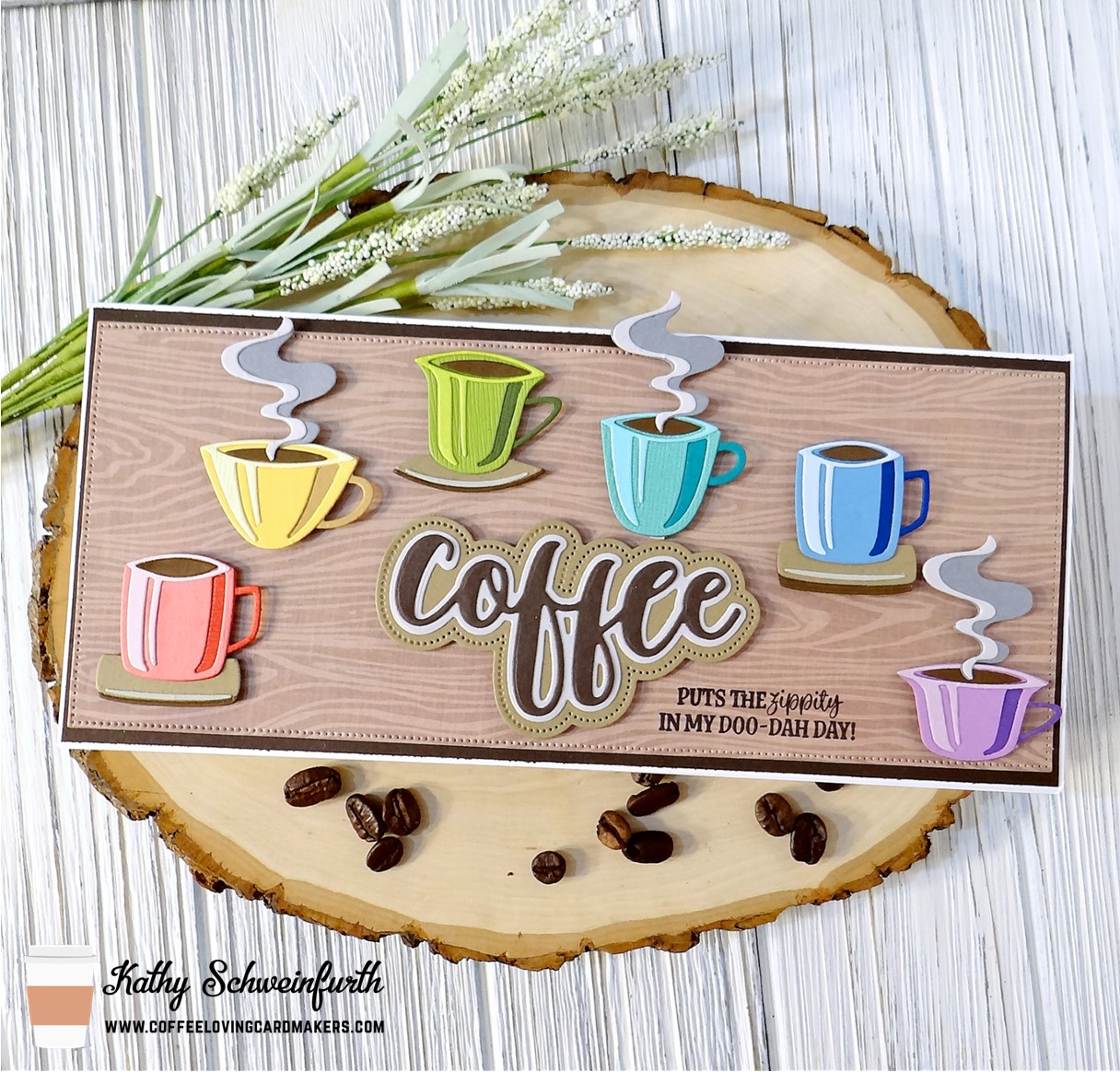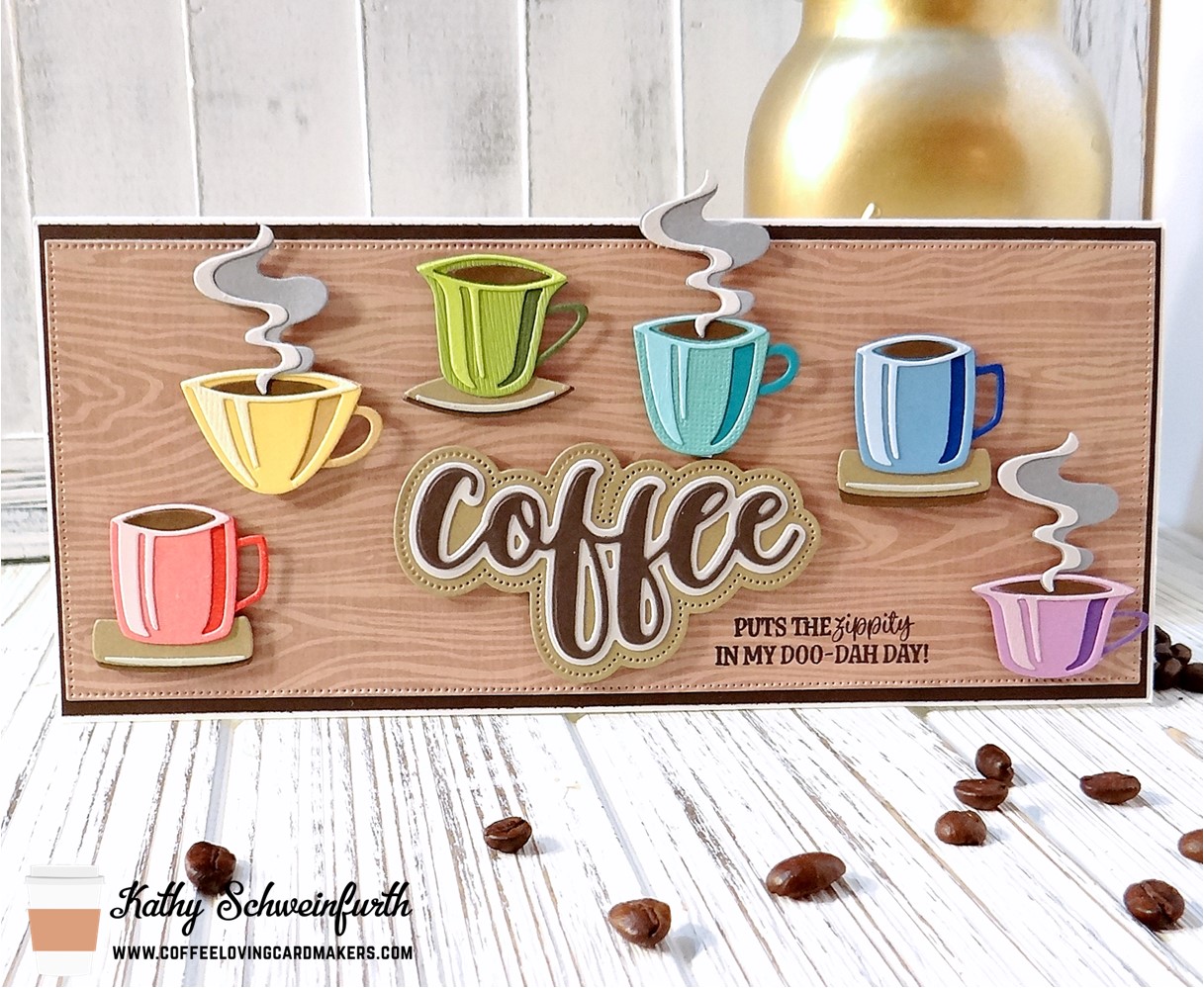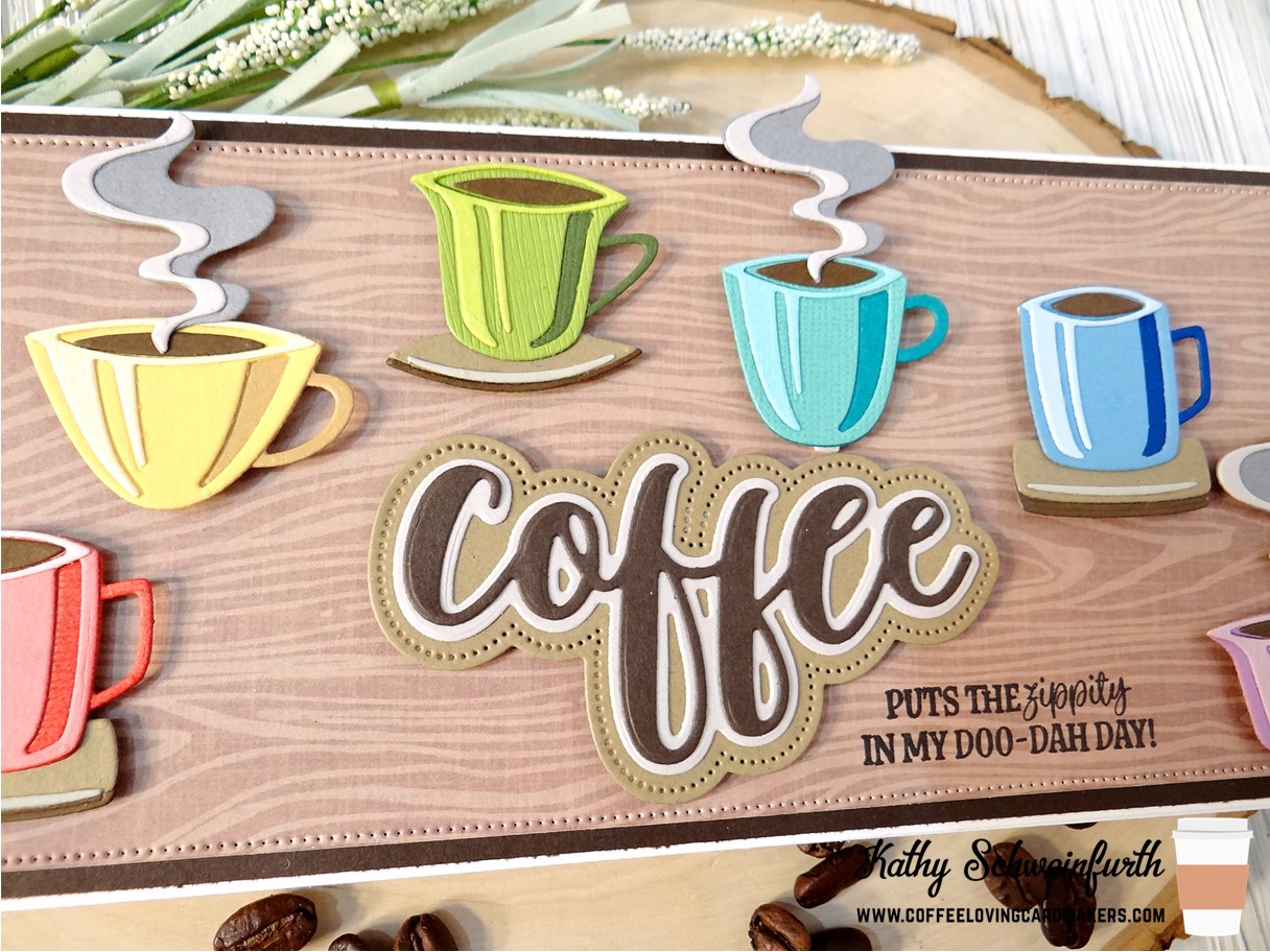 For my slimline card, I layered dark brown cardstock and cut wood grain pattern paper with Divinity Designs Slimline Pierced Rectangles die.  These FABULOUS cups were created with Tim Holtz/Sizzix Papercut Cafe dies!  I was super excited to get this set to make these colorized cups – so fun and easy to create (much, much easier than some of the other colorized die sets)!