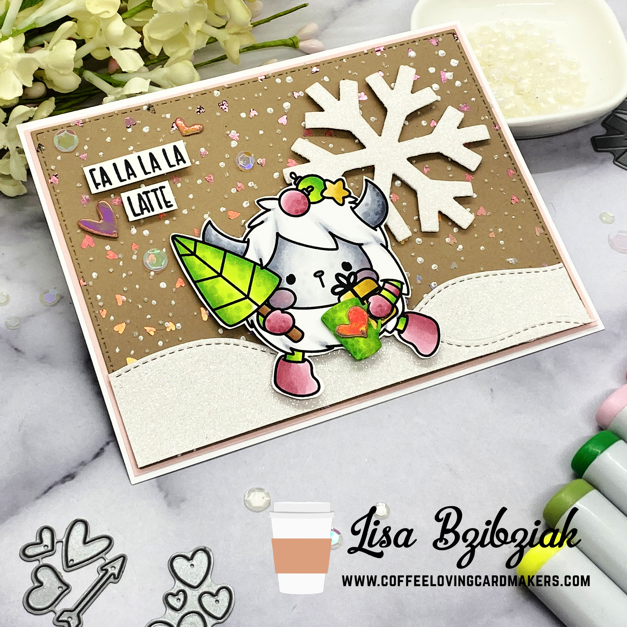 The snowflake and hearts are dies from Paper Smooches (always some of my fave stamps and dies). And I built my sentiment using a couple sets from Miss Ink Stamps.