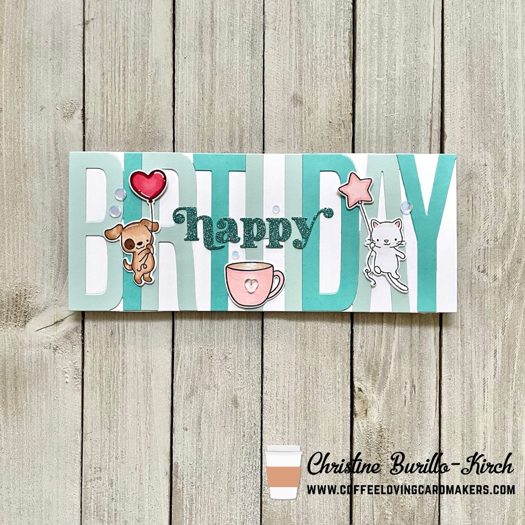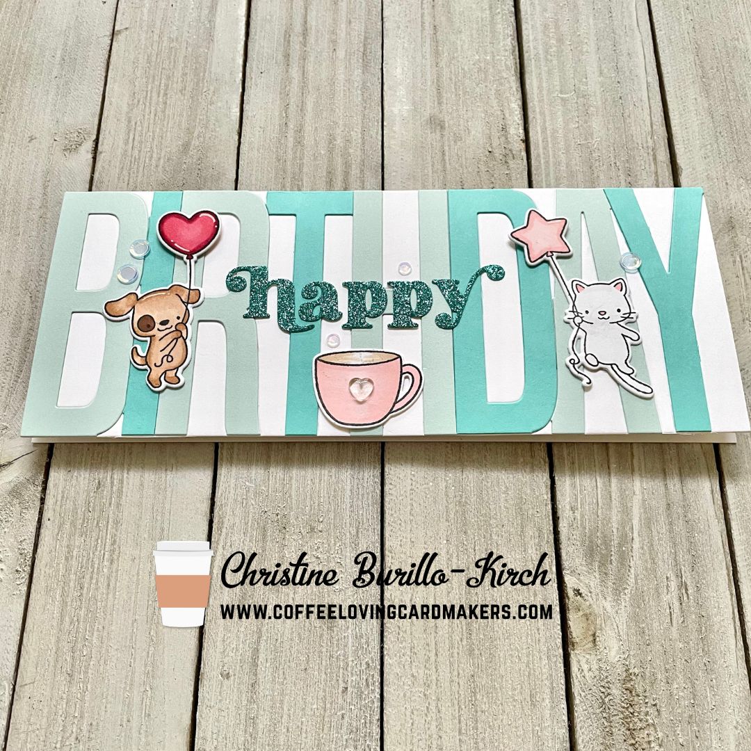 Hello there, Christine here with a birthday coffee card. I recently purchased a Spellbinders large slimline Birthday die set from Super Sponsor Simon Says Stamp and paired it with the Carried Away stamp and die set from Hello Bluebird.