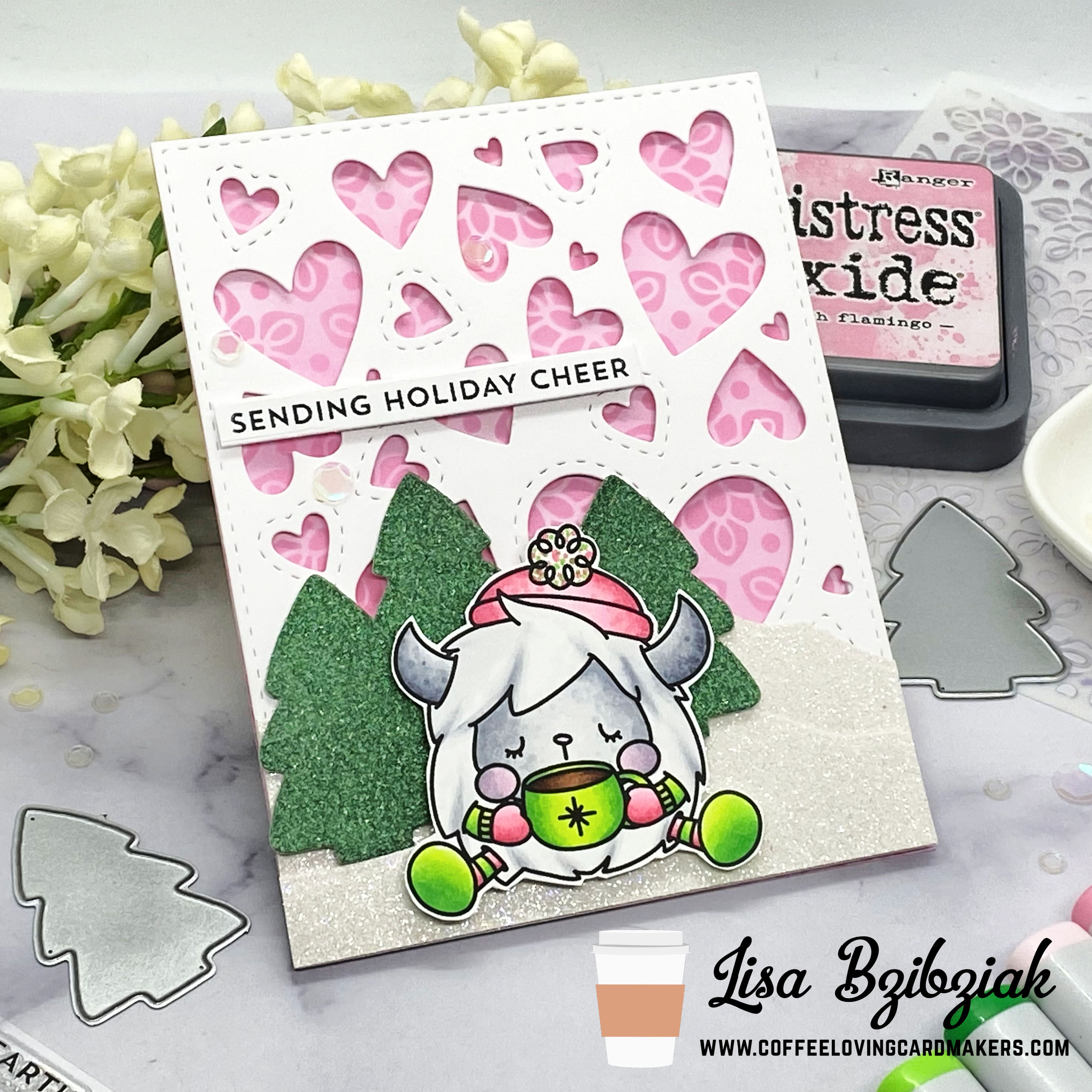 I decided I’d create a card for the current Caffeinated Christmas Card Challenge! Since our theme is hearts, I used that great Heart Background from CTMH. I popped it up over a background I created with some Distress Oxide Ink and the Frosty Flakes stencil from Miss Ink Stamps. Then I created a landscape scene with the Tabbed Mountains from Rubbernecker Stamps and some trees from Paper Smooches.